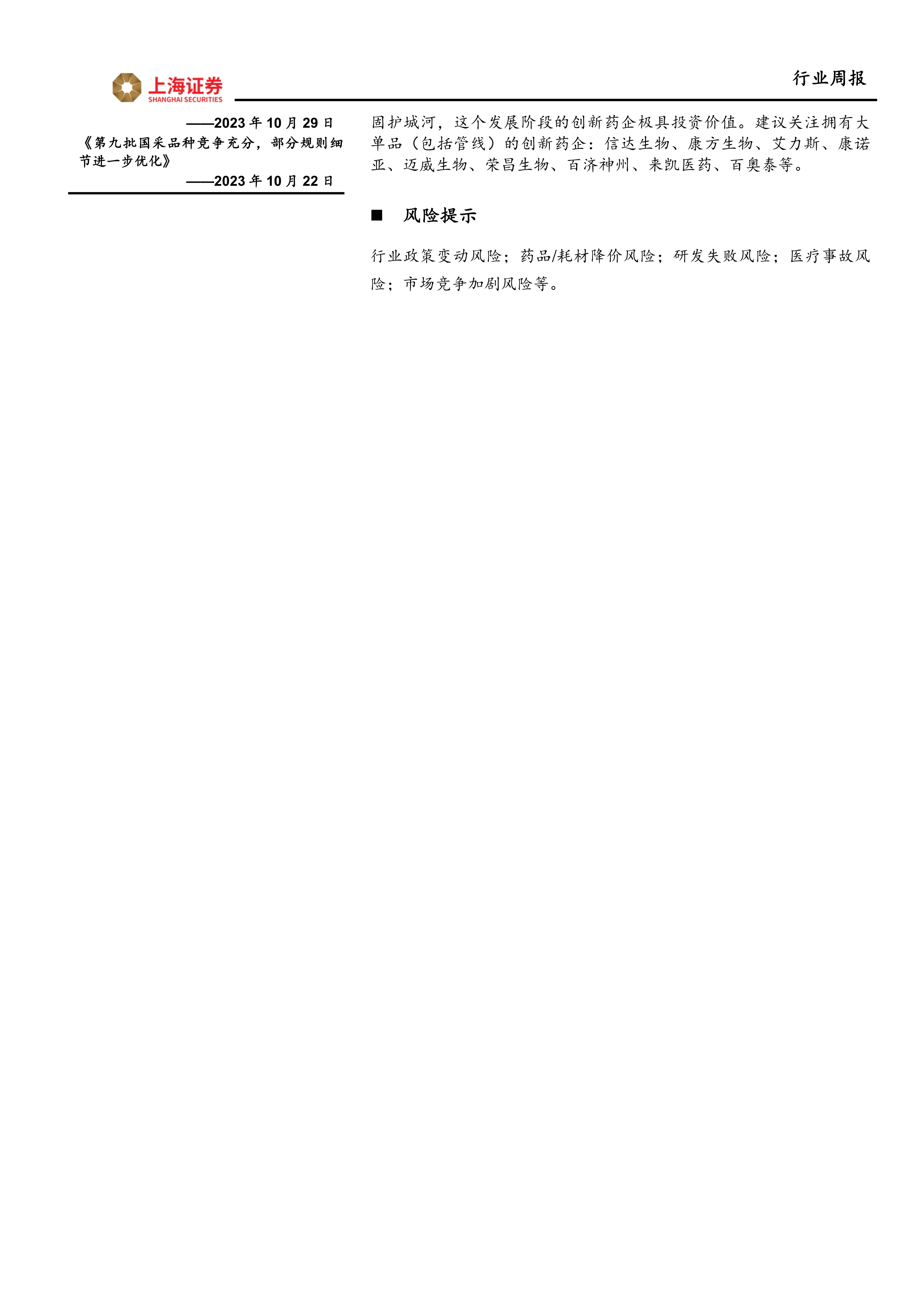 行业政策变动风险;药品/耗材降价风险;研发失败风险;医疗事故风险;市场竞争加剧风险等。