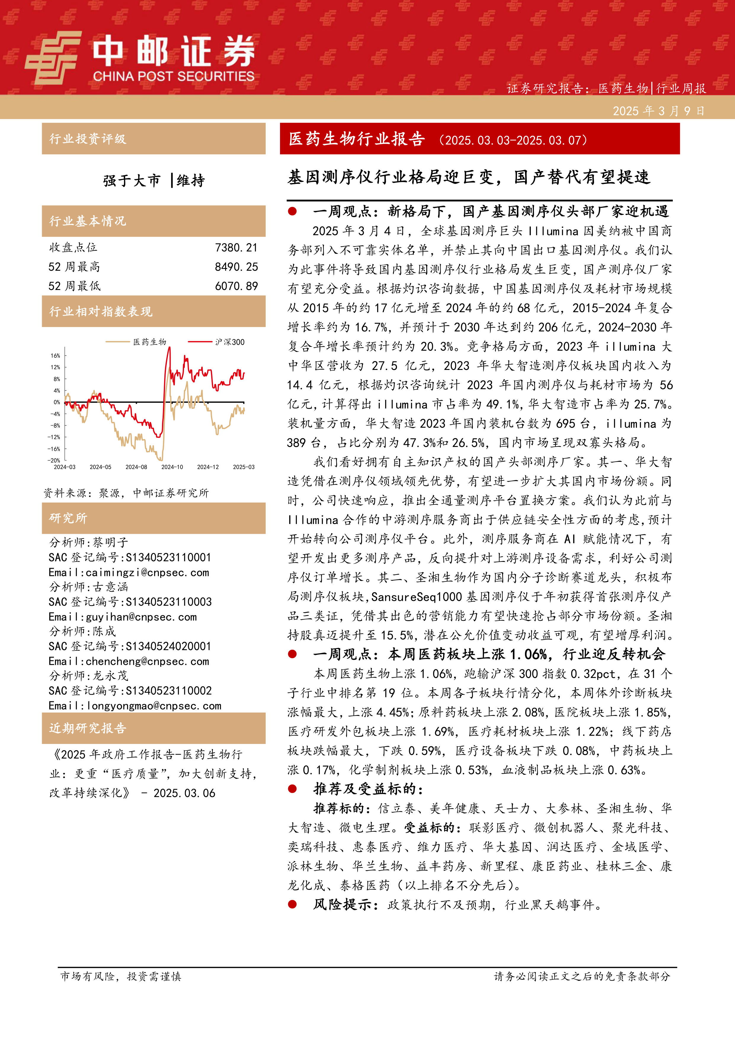 本周医药生物行业报告的核心观点指出,全球基因测序巨头Illumina被中国商务部列入不可靠实体名单,并禁止其向中国出口基因测序仪,这一事件将深刻改变国内基因测序仪行业的竞争格局。报告强调,此举为拥有自主知识产权的国产测序仪头部厂家带来了历史性发展机遇,国产替代进程有望显著提速。中国基因测序仪及耗材市场规模预计将从2024年的约68亿元增长至2030年的约206亿元,复合年增长率高达20.3%,市场潜力巨大。在这一背景下,华大智造和圣湘生物等国内领先企业凭借技术优势和市场布局,有望大幅提升市场份额。