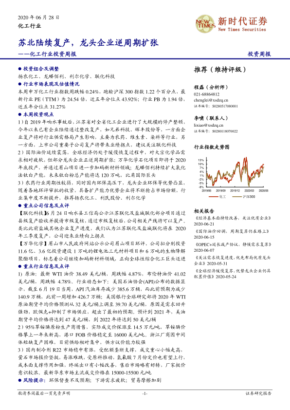 本报告对2020年6月28日化工行业投资周报进行了专业而深入的分析。核心观点聚焦于苏北地区化工企业的陆续复产,这为相关上市公司带来了业绩拐点,并对农药、维生素、染料等细分市场的供需格局产生积极影响。同时,报告强调了在国际油价震荡和全球经济缓慢复苏的背景下,万华化学、龙蟒佰利等化工龙头企业通过逆周期扩张,积极布局新材料和扩大优势产能,展现出强大的发展韧性。