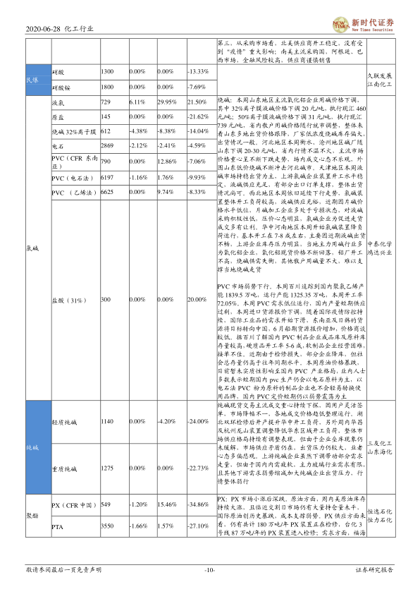 本周WTI原油价格为38.49美元/桶,周跌幅4.87%;布伦特原油价格为41.02美元/桶,周跌幅4.78%。美国石油协会(API)数据显示,截至6月19日当周,API汽油库存减少385.6万桶,超出此前预期。美国银行全球研究部将2020年WTI原油期货平均价格预测上调至39.70美元/桶,预计2021年和2022年将分别达到47美元/桶和50美元/桶,主要原因在于需求强劲回升以及欧佩克+对市场供应的有效抑制。国际乙烯价格本周持平,月涨幅23.44%,年涨幅17.91%。国内纯苯周跌幅7.51%,月跌幅5.19%,年跌幅44.35%。