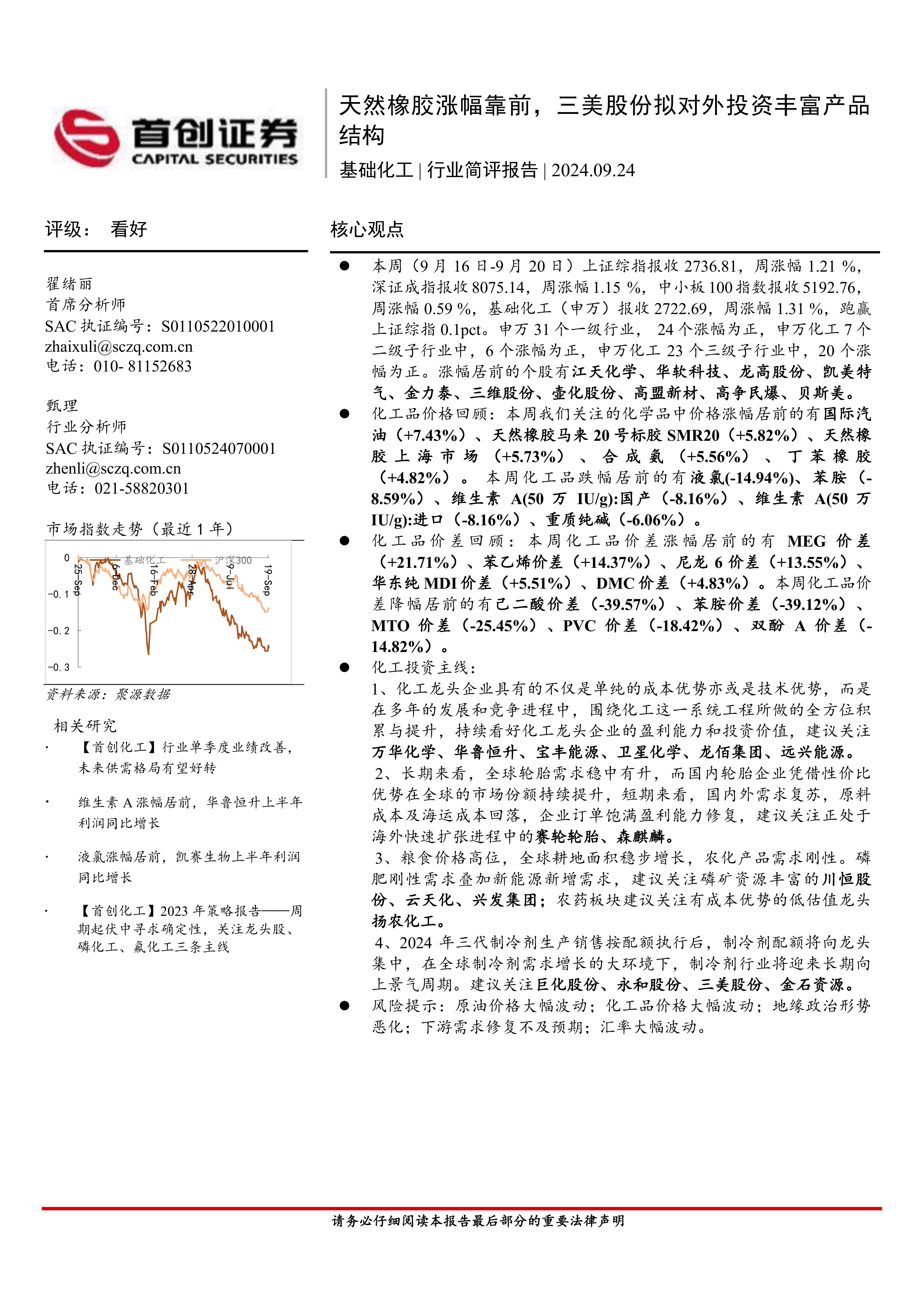 基础化工行业简评报告:天然橡胶涨幅靠前,三美股份拟对外投资丰富产品结构