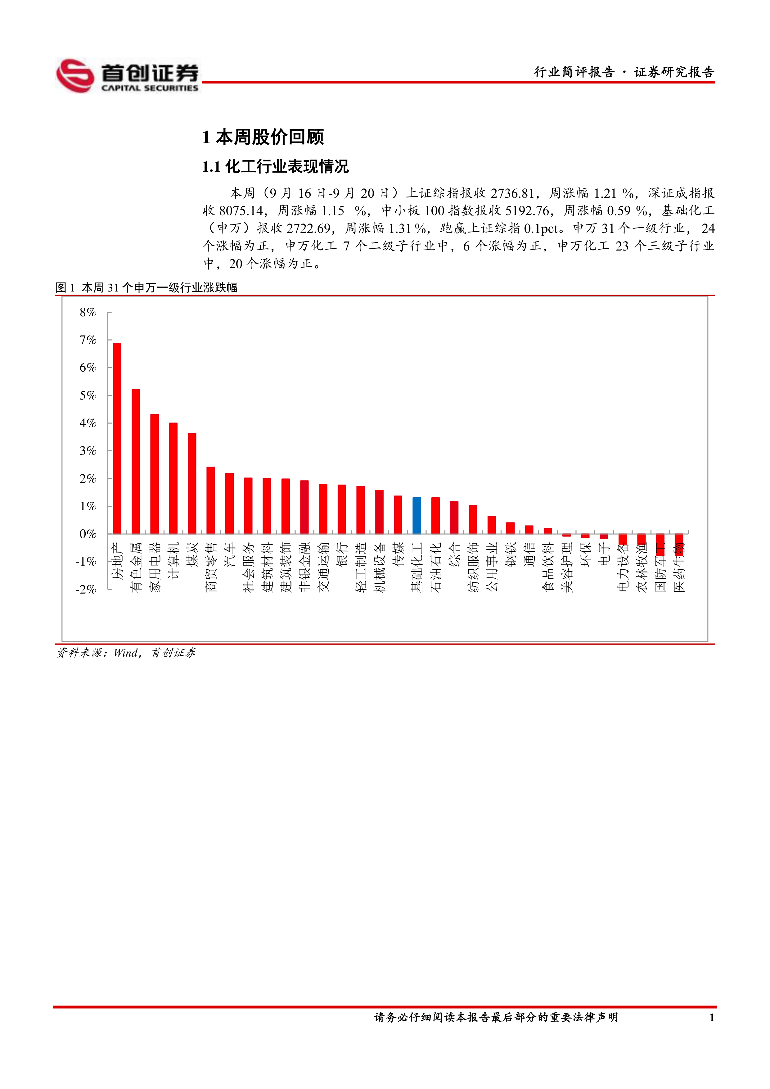 本周(9月16日-9月20日)上证综指报收2736.81,周涨幅1.21%,深证成指报收8075.14,周涨幅1.15%,中小板100指数报收5192.76,周涨幅0.59%,基础化工(申万)报收2722.69,周涨幅1.31%,跑赢上证综指0.1pct。申万31个一级行业,24个涨幅为正,申万化工7个二级子行业中,6个涨幅为正,申万化工23个三级子行业中,20个涨幅为正。涨幅居前的个股有江天化学、华软科技、龙高股份、凯美特气、金力泰、三维股份、壶化股份、高盟新材、高争民爆、贝斯美。