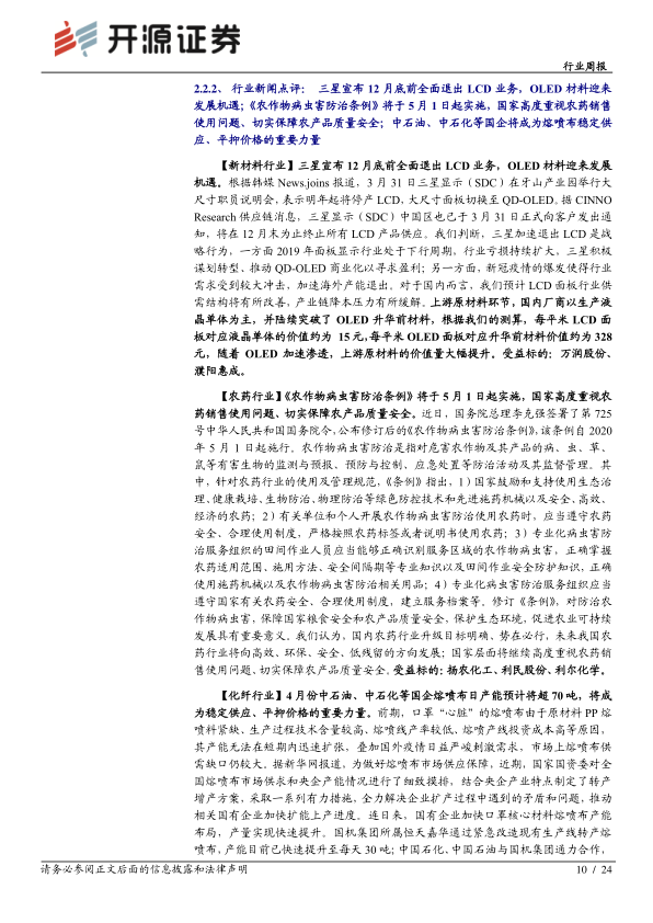 本报告分析了近期化工行业的市场动态,重点关注了浙江自贸区成品油出口政策放开、OPEC+减产预期以及三星退出LCD业务等事件对行业的影响。报告建议关注民营大炼化和MDI行业龙头的长期布局机会,以及OLED材料领域的发展机遇。同时,报告也提示了油价下跌、环保督察和下游需求疲软等风险因素。