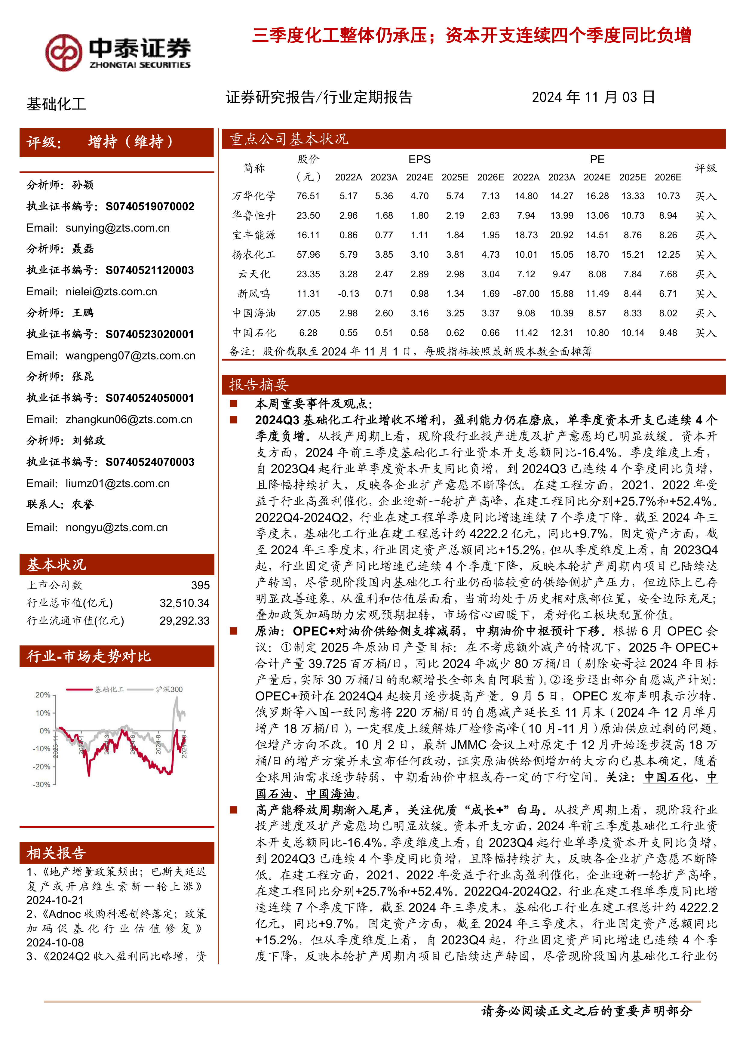 2024年第三季度,基础化工行业整体面临增收不增利的局面,盈利能力持续磨底。然而,行业资本开支已连续四个季度同比负增长,且降幅持续扩大,表明企业扩产意愿显著放缓,供给侧压力边际改善。同时,部分细分领域如食品及饲料添加剂、轮胎、制冷剂等,在特定供需因素驱动下展现出景气度回暖或业绩高增的结构性亮点。