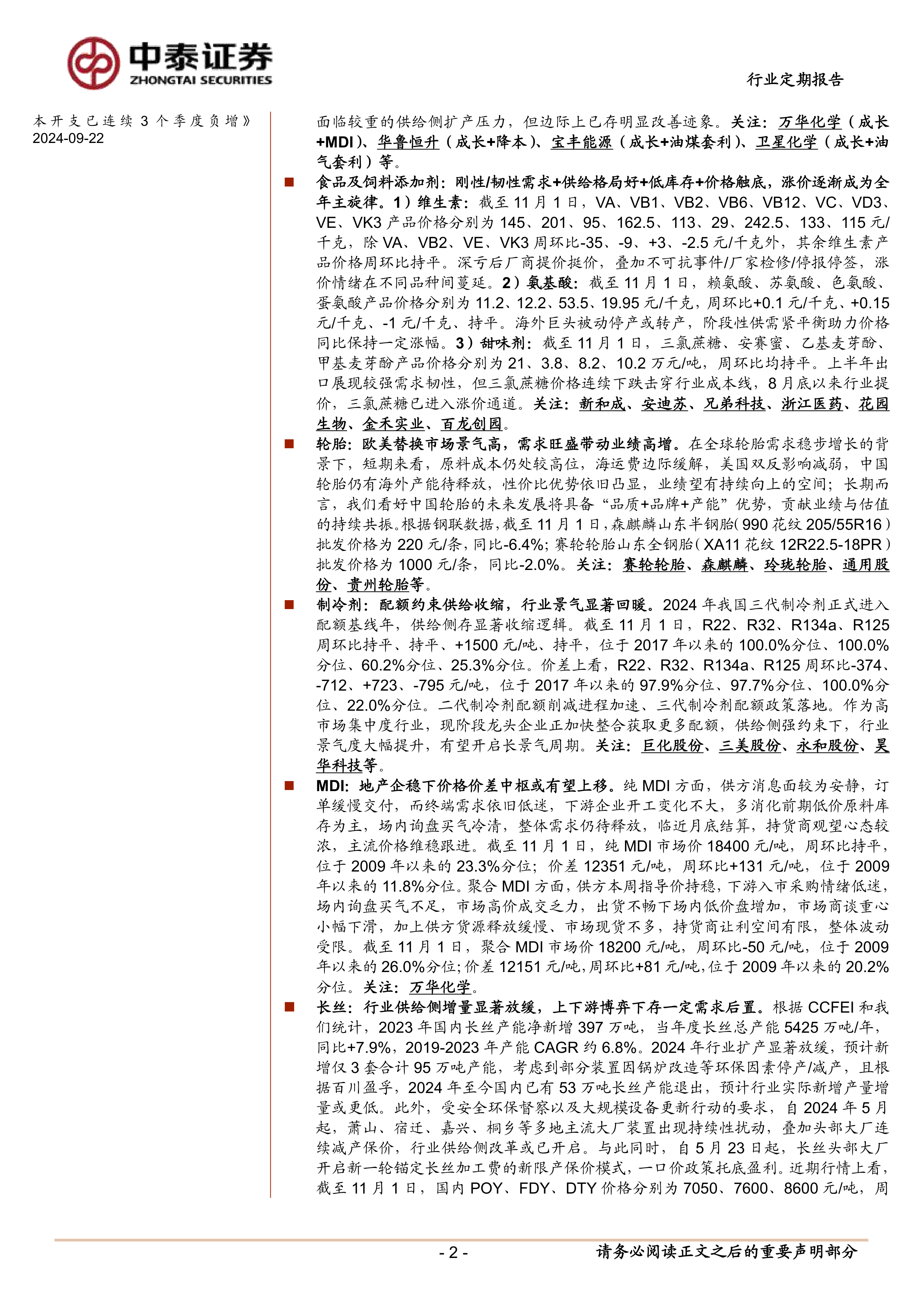 食品及饲料添加剂:刚性/韧性需求+供给格局好+低库存+价格触底,涨价逐渐成为全年主旋律。1)维生素:截至11月1日,VA、VB1、VB2、VB6、VB12、VC、VD3、VE、VK3产品价格分别为145、201、95、162.5、113、29、242.5、133、115元/千克,除VA、VB2、VE、VK3周环比-35、-9、+3、-2.5元/千克外,其余维生素产品价格周环比持平。深亏后厂商提价挺价,叠加不可抗事件/厂家检修/停报停签,涨价情绪在不同品种间蔓延。2)氨基酸:截至11月1日,赖氨酸、苏氨酸、色氨酸、蛋氨酸产品价格分别为11.2、12.2、53.5、19.95元/千克,周环比+0.1元/千克、+0.15元/千克、-1元/千克、持平。海外巨头被动停产或转产,阶段性供需紧平衡助力价格同比保持一定涨幅。3)甜味剂:截至11月1日,三氯蔗糖、安赛蜜、乙基麦芽酚、甲基麦芽酚产品价格分别为21、3.8、8.2、10.2万元/吨,周环比均持平。上半年出口展现较强需求韧性,但三氯蔗糖价格连续下跌击穿行业成本线,8月底以来行业提价,三氯蔗糖已进入涨价通道。关注:新和成、安迪苏、兄弟科技、浙江医药、花园生物、金禾实业、百龙创园。