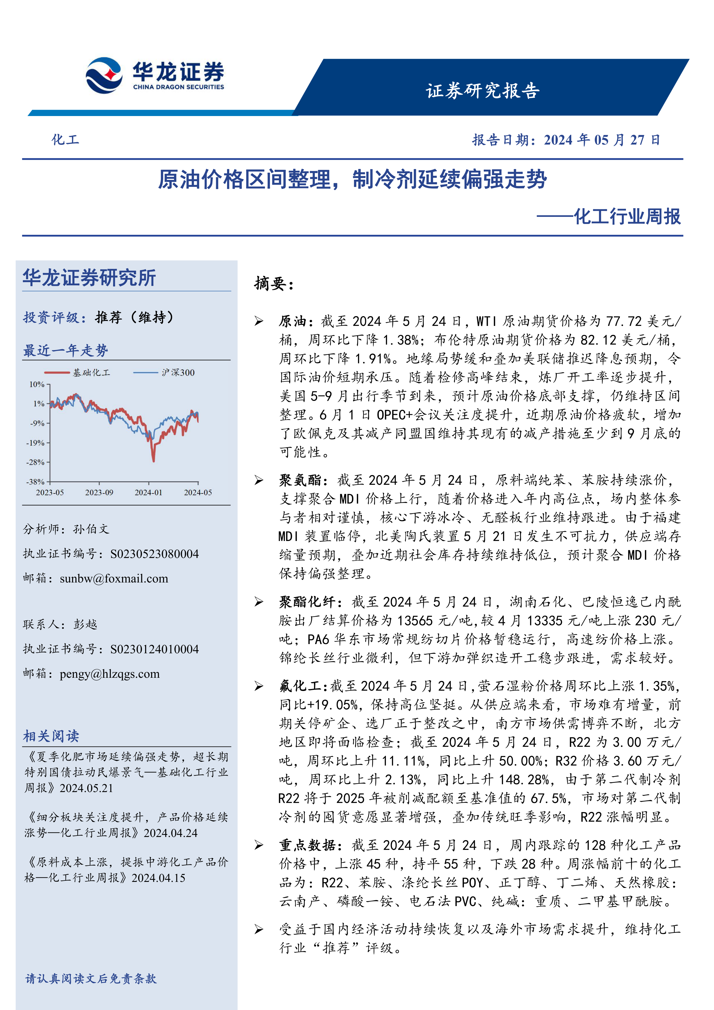 本报告核心观点指出,在2024年5月20日至5月24日期间,化工行业整体表现出结构性分化,但受益于国内经济活动持续恢复及海外市场需求提升,华龙证券研究所维持对化工行业的“推荐”评级。国际原油价格短期承压后预计将维持区间整理,而制冷剂、聚氨酯等细分领域因供需关系紧张和季节性旺盛需求,延续偏强走势,成为本周市场亮点。