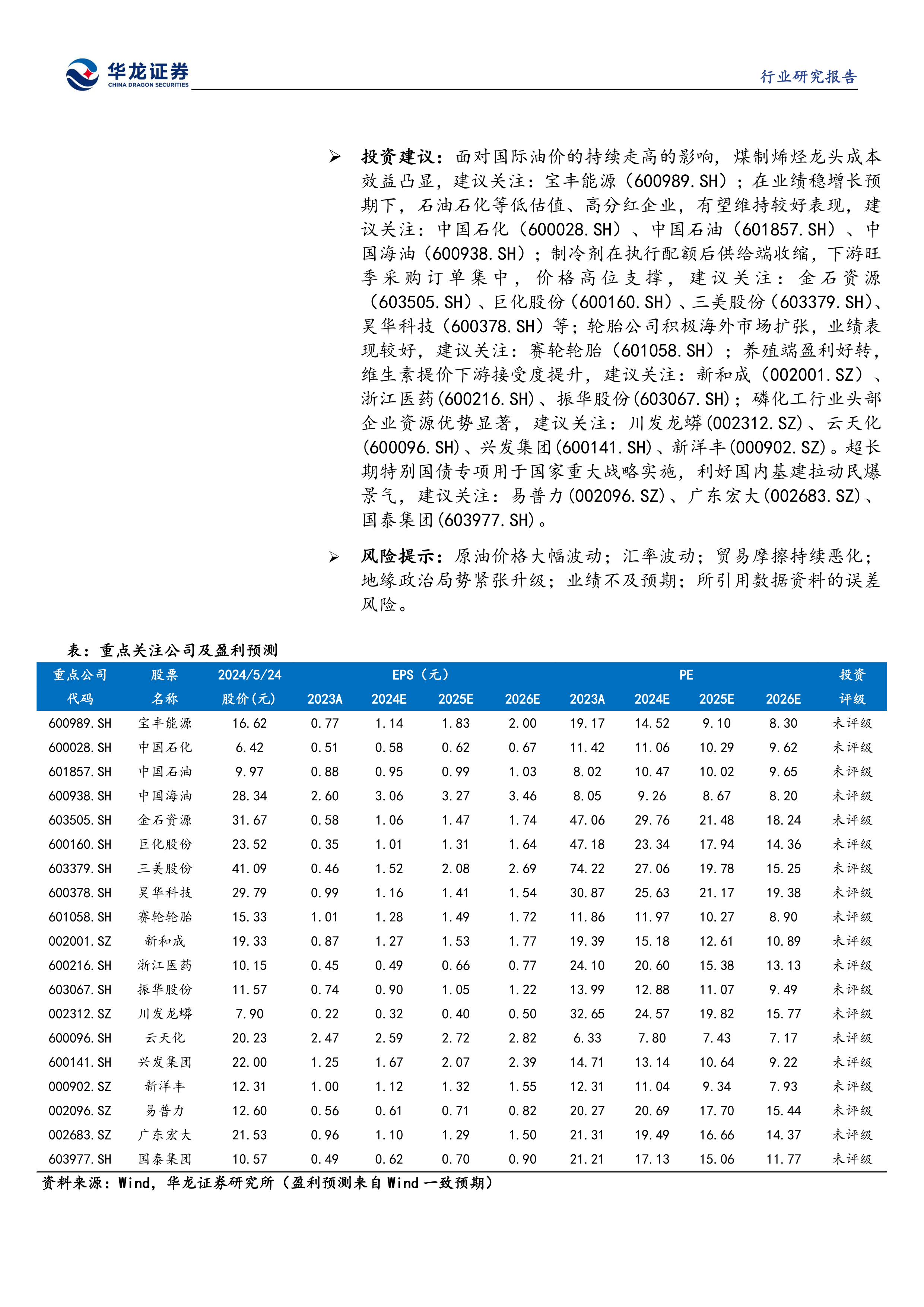 投资建议:面对国际油价的持续走高的影响,煤制烯烃龙头成本效益凸显,建议关注:宝丰能源(600989.SH);在业绩稳增长预期下,石油石化等低估值、高分红企业,有望维持较好表现,建议关注:中国石化(600028.SH)、中国石油(601857.SH)、中国海油(600938.SH);制冷剂在执行配额后供给端收缩,下游旺季采购订单集中,价格高位支撑,建议关注:金石资源(603505.SH)、巨化股份(600160.SH)、三美股份(603379.SH)、昊华科技(600378.SH)等;轮胎公司积极海外市场扩张,业绩表现较好,建议关注:赛轮轮胎(601058.SH);养殖端盈利好转,维生素提价下游接受度提升,建议关注:新和成(002001.SZ)、浙江医药(600216.SH)、振华股份(603067.SH);磷化工行业头部企业资源优势显著,建议关注:川发龙蟒(002312.SZ)、云天化(600096.SH)、兴发集团(600141.SH)、新洋丰(000902.SZ)。超长期特别国债专项用于国家重大战略实施,利好国内基建拉动民爆景气,建议关注:易普力(002096.SZ)、广东宏大(002683.SZ)、国泰集团(603977.SH)。