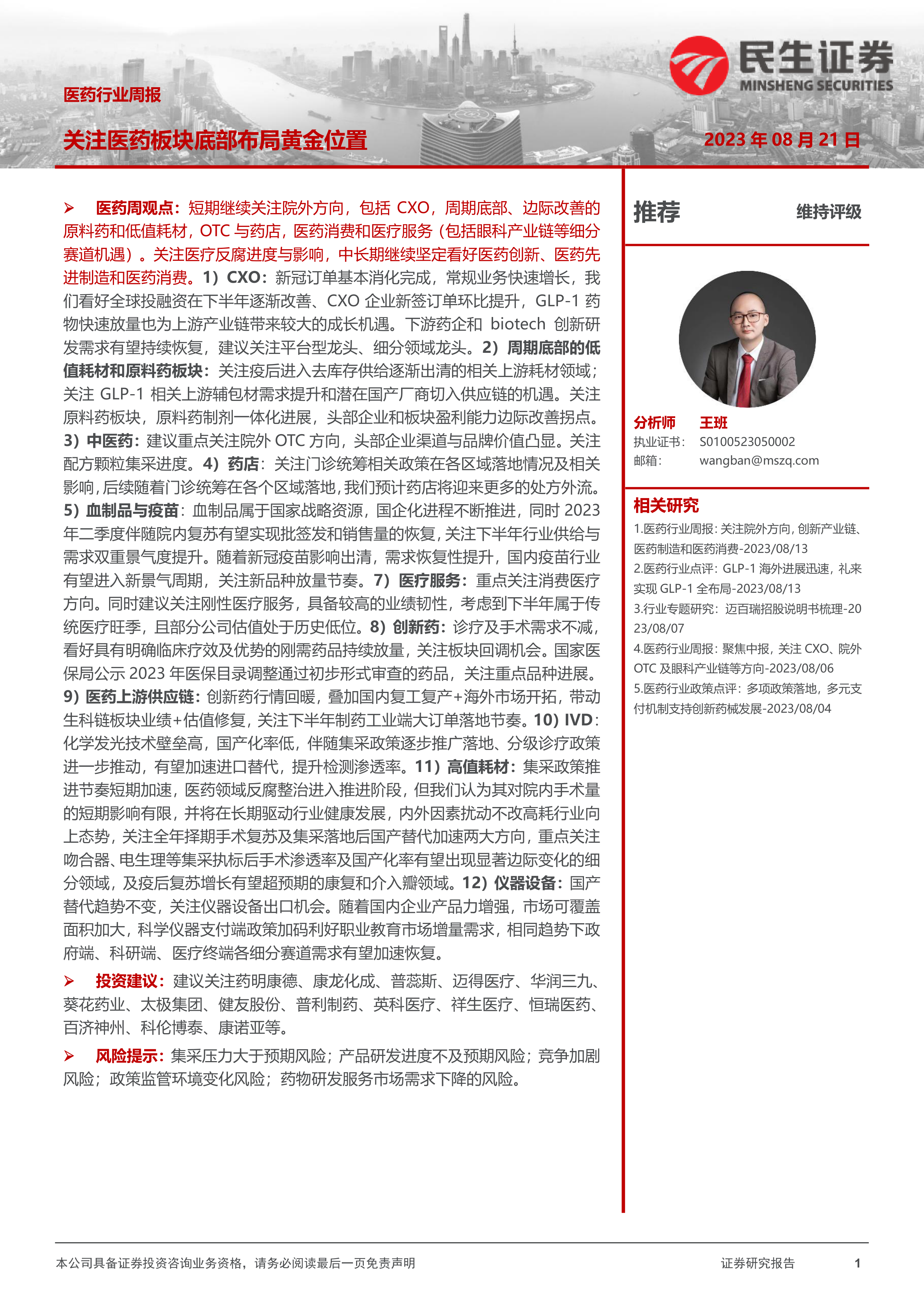 本报告核心观点指出,当前医药板块正处于底部布局的黄金位置,短期内应重点关注院外市场,包括CXO、周期底部改善的原料药和低值耗材、OTC与药店、医药消费和医疗服务等细分赛道。中长期来看,医药创新、医药先进制造和医药消费仍是坚定看好的方向。