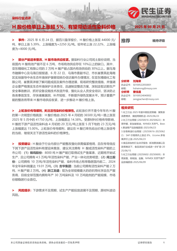 H酸价格因部分关键产能整改导致市场供应收紧,单日上涨超5%,较年初累计上涨超22%。历史数据显示,H酸价格上涨能有效传导至下游活性染料,预计本轮涨价也将带动活性染料价格上行。在供需偏紧和价格传导的背景下,建议投资者关注拥有H酸或活性染料产能的上市公司,以把握行业结构性变化带来的投资机会,同时需注意下游需求、产能投放及原材料波动等潜在风险。
