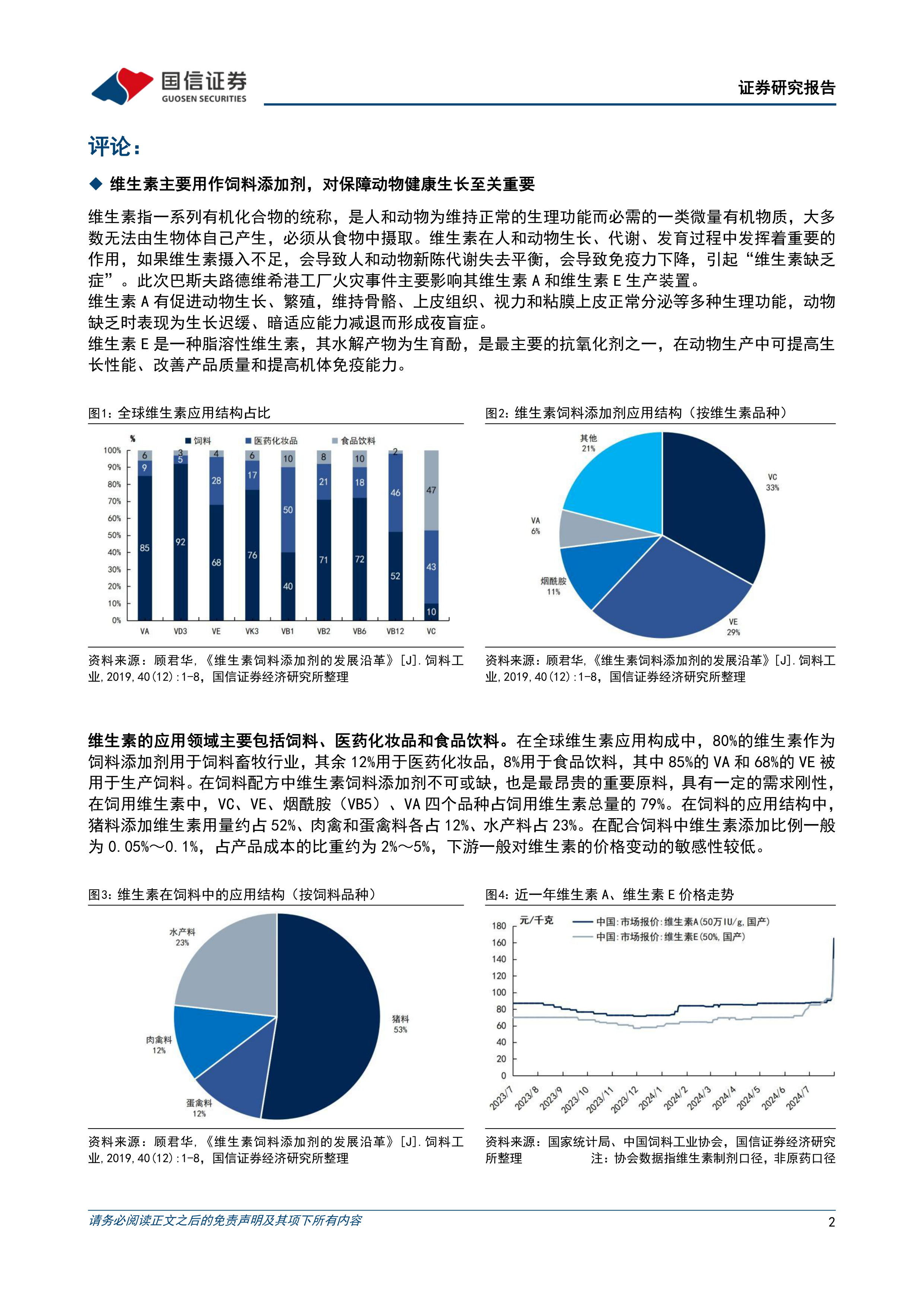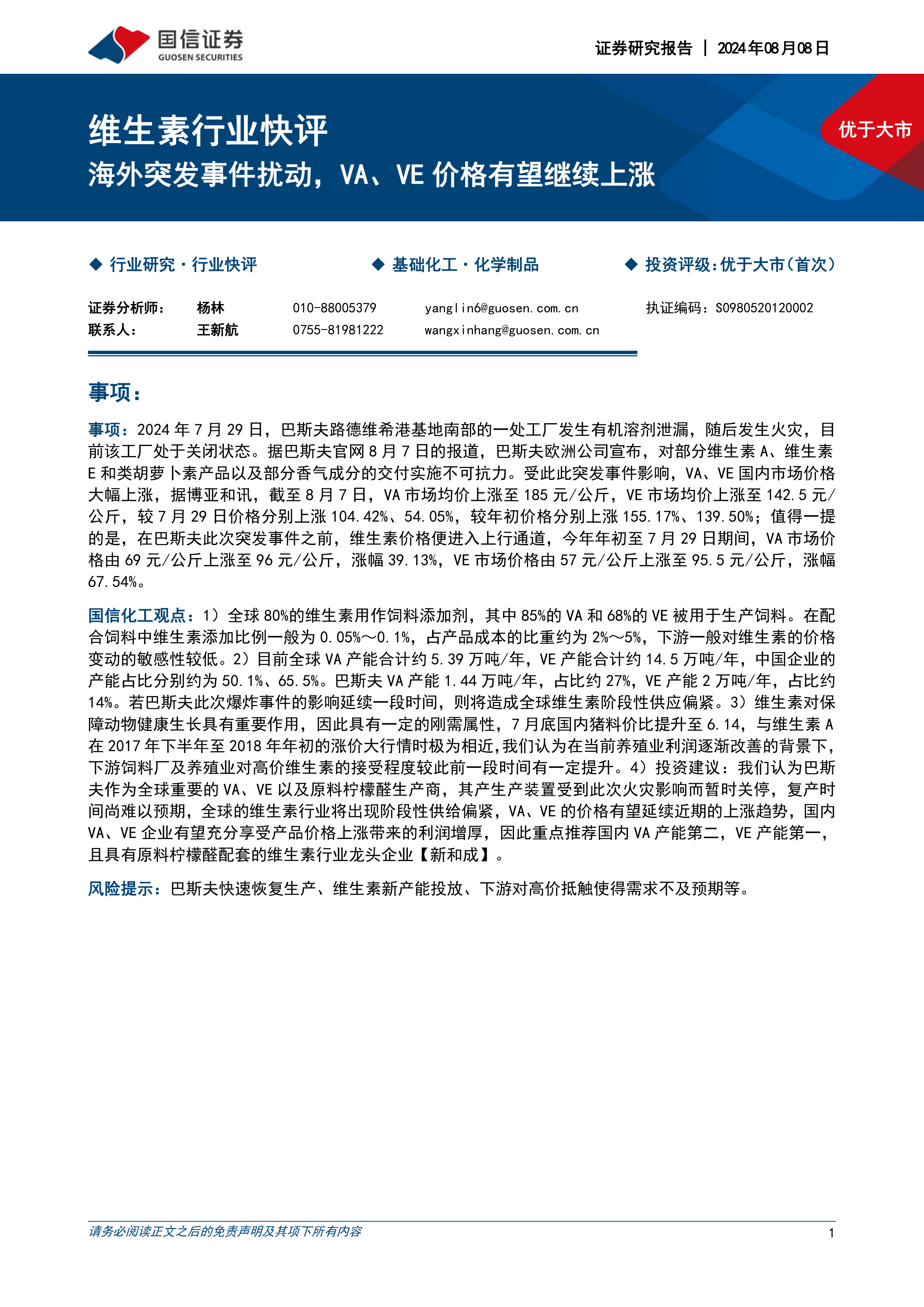 巴斯夫突发事件导致全球维生素A和维生素E供给阶段性偏紧,叠加下游养殖业利润回暖提升了对高价维生素的接受度,预计VA、VE市场价格将延续上涨趋势。在此背景下,国内维生素行业龙头企业,特别是具备VA、VE领先产能和柠檬醛配套的新和成,有望充分受益于产品价格上涨带来的利润增厚。报告维持对新和成的“优于大市”投资评级,并建议投资者关注其盈利增长潜力。然而,需警惕巴斯夫快速恢复生产、维生素新产能投放以及下游需求不及预期等风险。