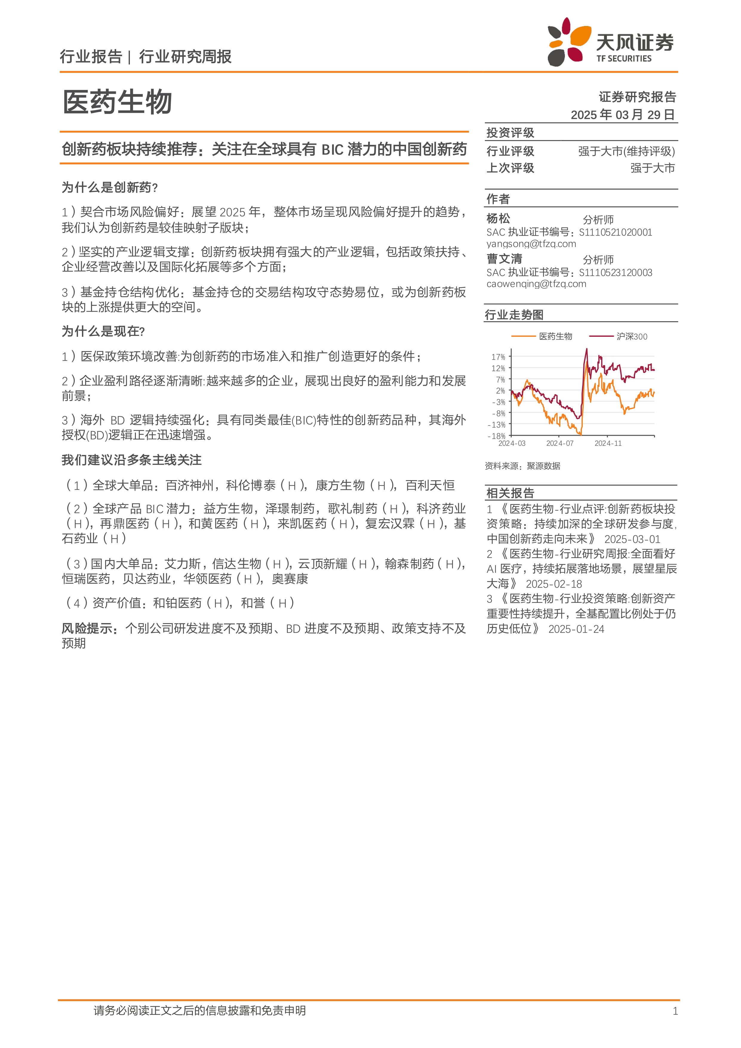 报告建议关注全球大单品、全球产品BIC潜力、国内大单品以及资产价值等多个投资主线,并提示了研发进度、BD进度以及政策支持等方面的风险。