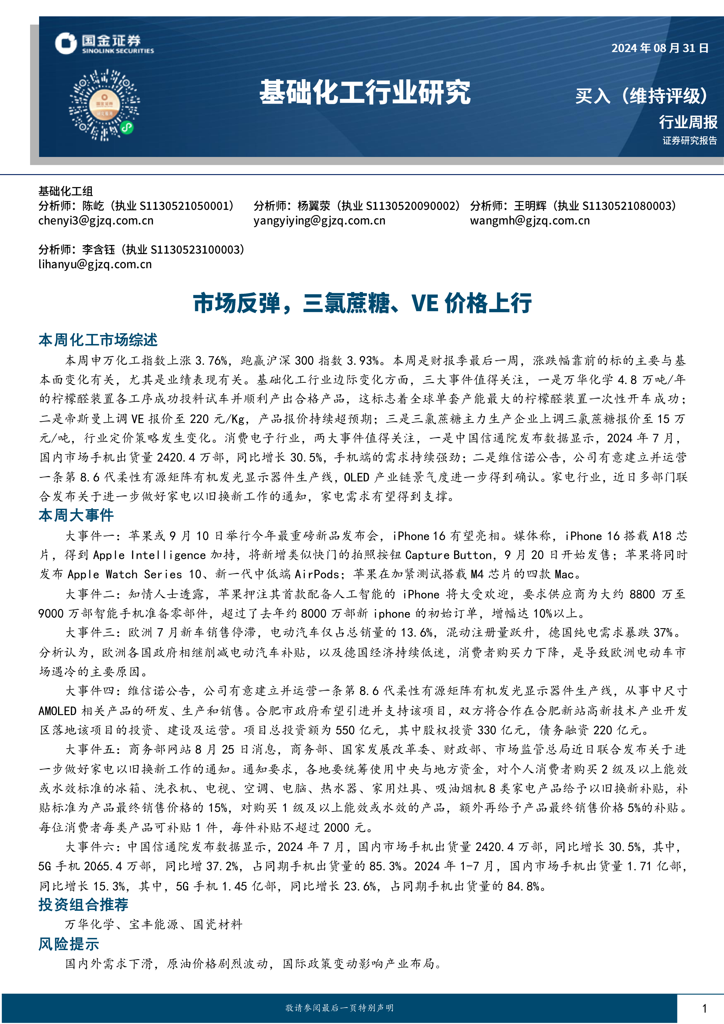 本周申万化工指数上涨3.76%,跑赢沪深300指数3.93%。本周是财报季最后一周,涨跌幅靠前的标的主要与基本面变化有关,尤其是业绩表现有关。基础化工行业边际变化方面,三大事件值得关注,一是万华化学4.8万吨/年的柠檬醛装置各工序成功投料试车并顺利产出合格产品,这标志着全球单套产能最大的柠檬醛装置一次性开车成功;二是帝斯曼上调VE报价至220元/Kg,产品报价持续超预期;三是三氯蔗糖主力生产企业上调三氯蔗糖报价至15万元/吨,行业定价策略发生变化。消费电子行业,两大事件值得关注,一是中国信通院发布数据显示,2024年7月,国内市场手机出货量2420.4万部,同比增长30.5%,手机端的需求持续强劲;二是维信诺公告,公司有意建立并运营一条第8.6代柔性有源矩阵有机发光显示器件生产线,OLED产业链景气度进一步得到确认。家电行业,近日多部门联合发布关于进一步做好家电以旧换新工作的通知,家电需求有望得到支撑。
