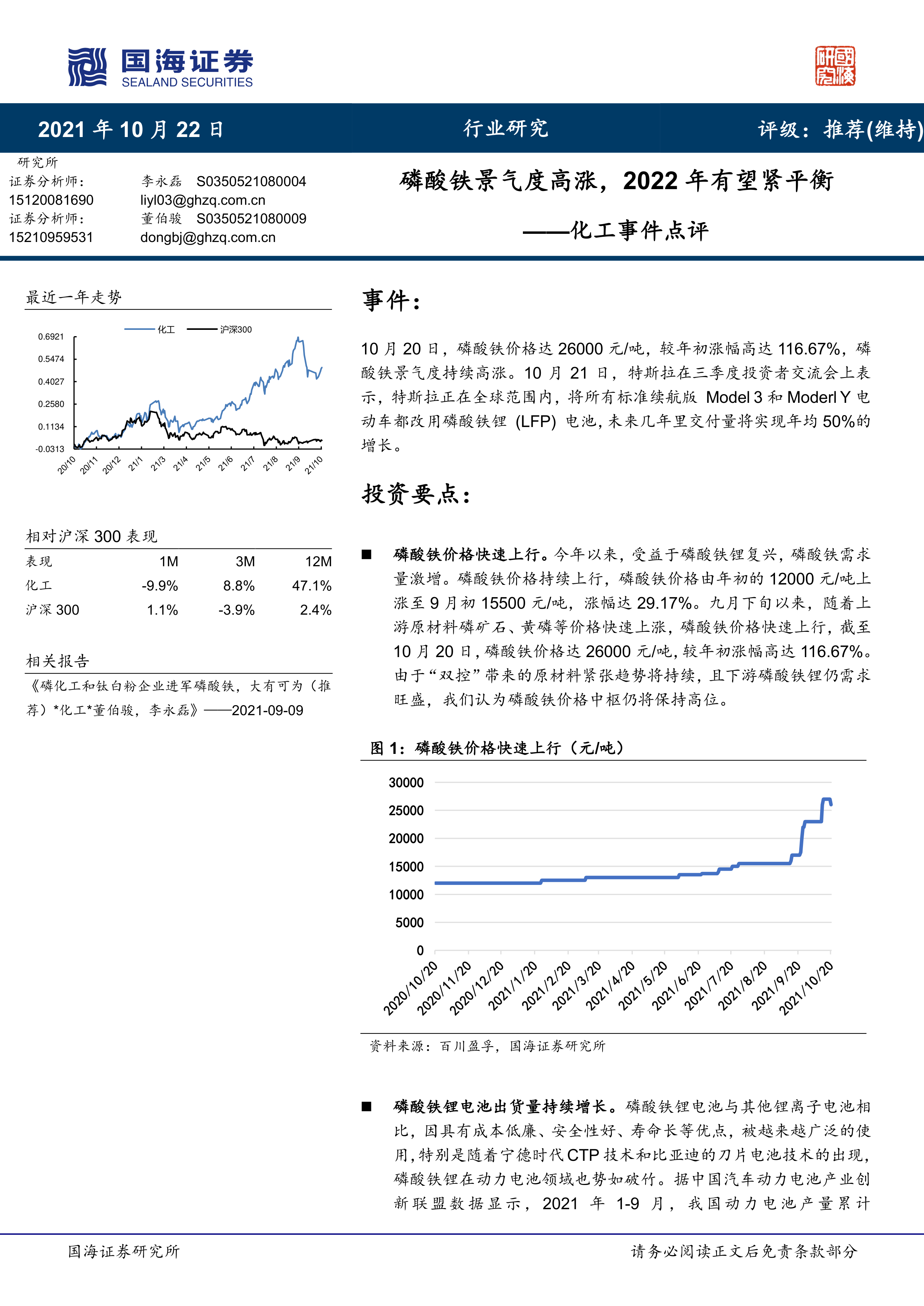 化工事件点评:磷酸铁景气度高涨,2022年有望紧平衡