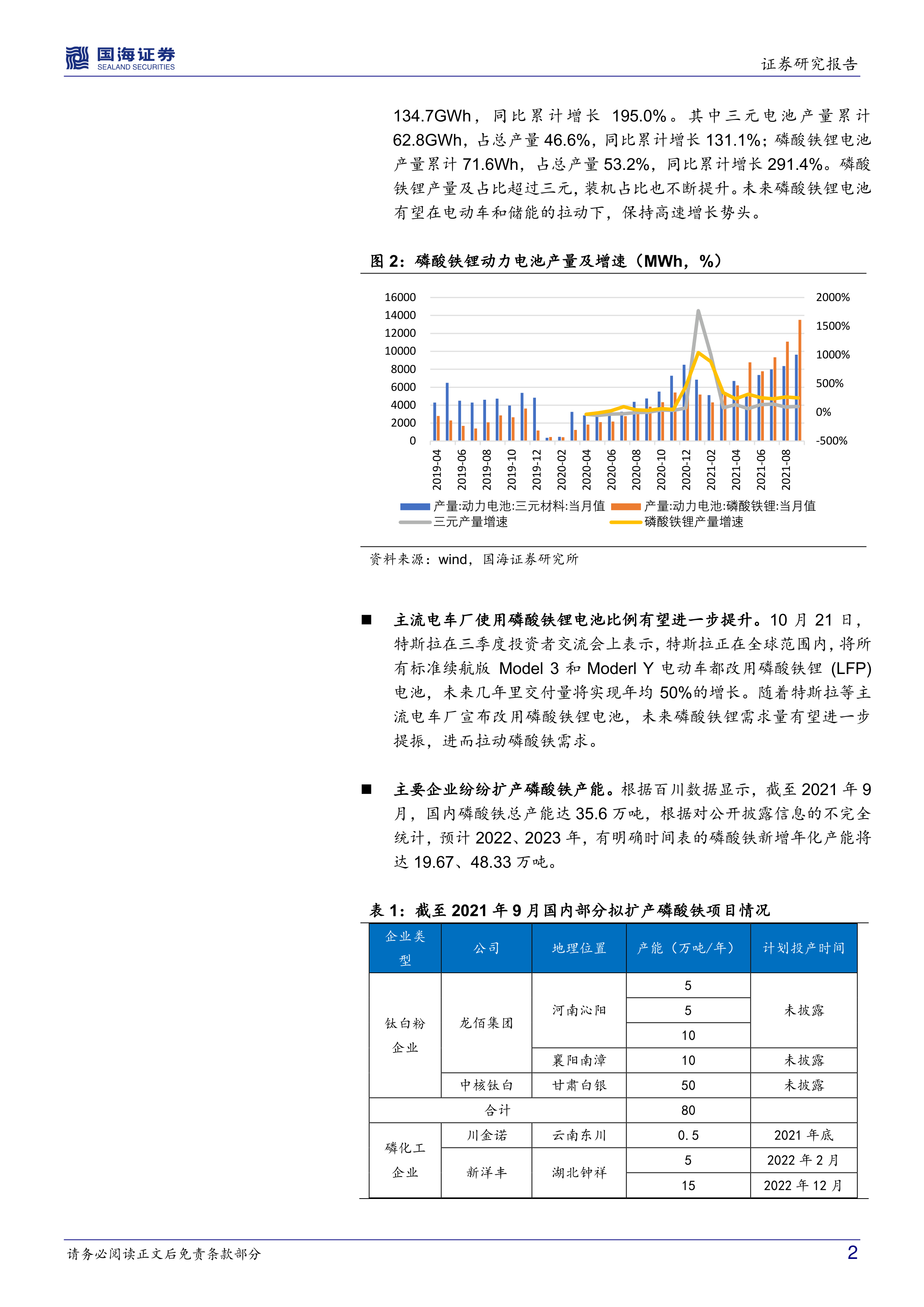 截至2021年9月,国内磷酸铁总产能达35.6万吨。多家企业计划扩产,预计2022、2023年新增年化产能将达19.67、48.33万吨。