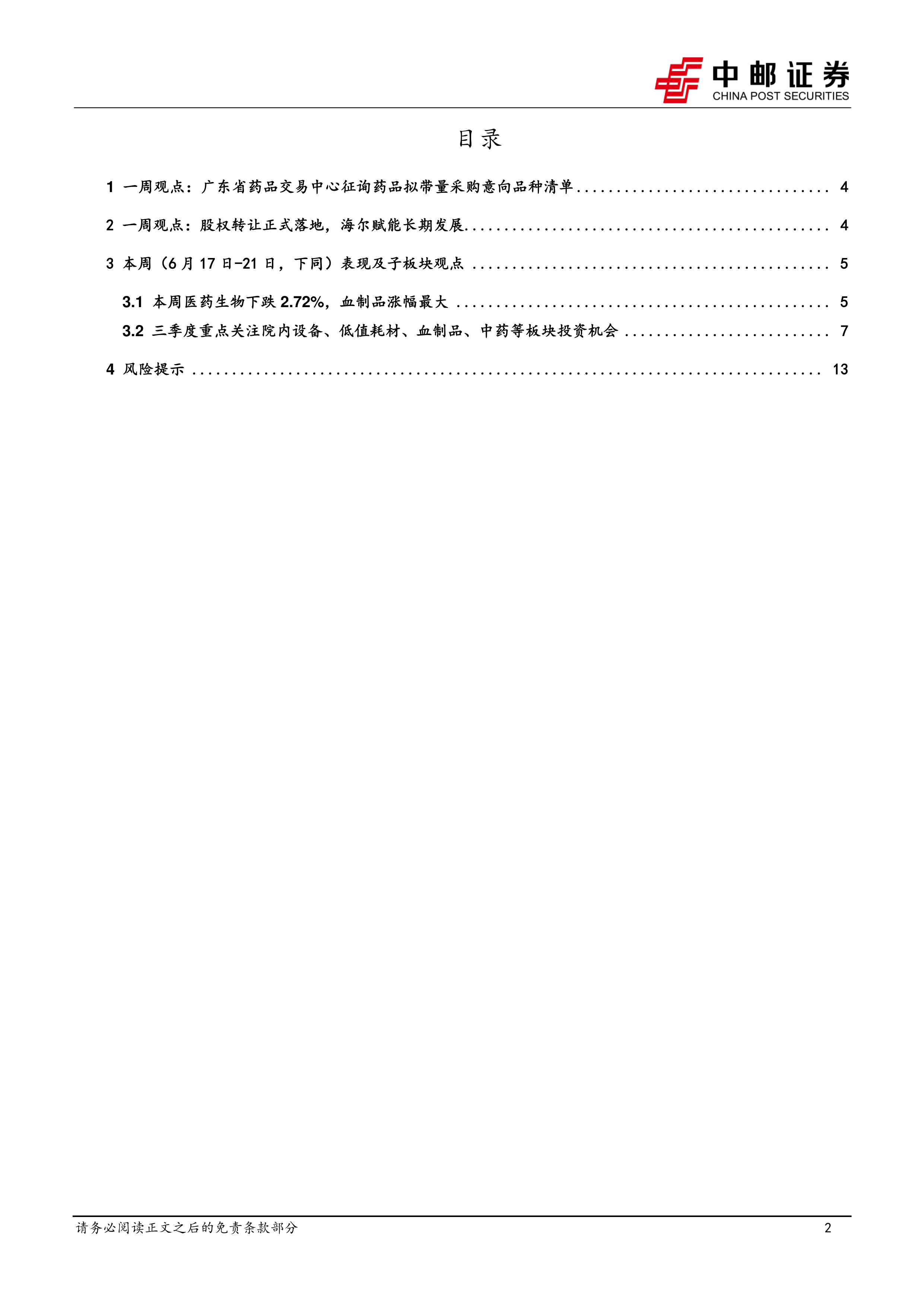 一周表现:本周(6月17日-21日)医药板块下跌2.72%三季度重点关注院内设备、低值耗材、血制品、中药等板块投资机会