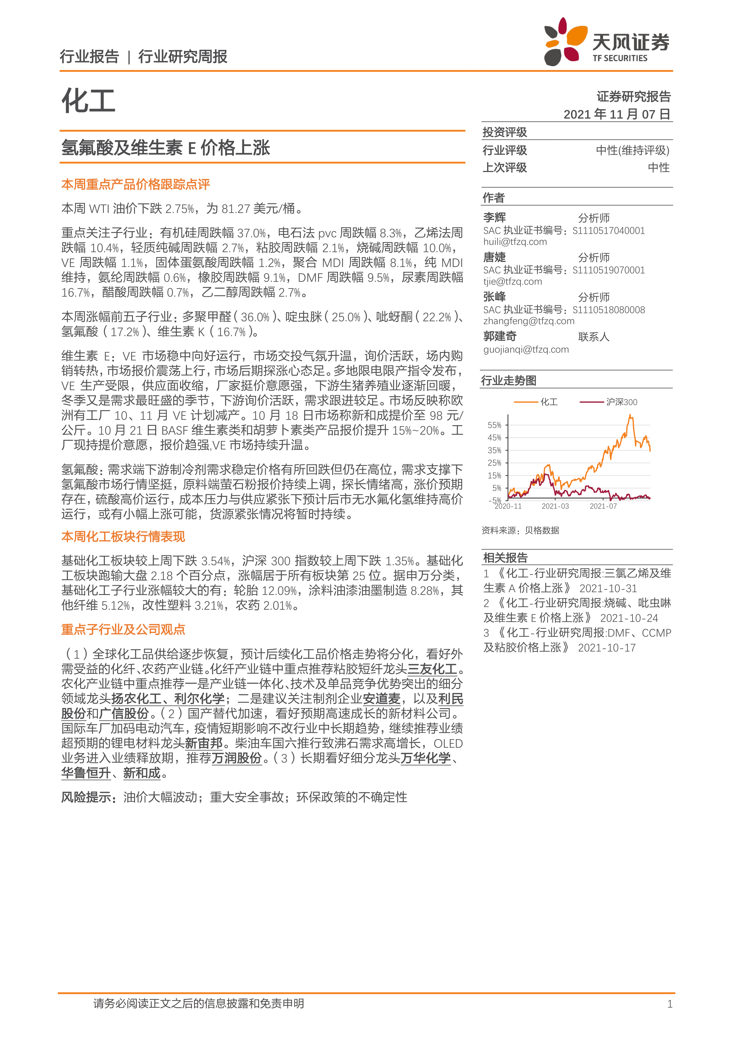化工行业研究周报:氢氟酸及维生素E价格上涨