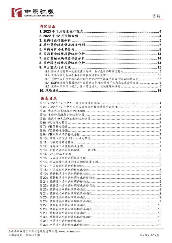 1月月度核心观点。近期国内多省份新冠疫情感染已经达峰,建议围绕“阳康”保健及消费复苏两条主线来寻找投资机会。1)关注辅酶Q10相关上市公司,如新和成(002001)。汤臣倍健(300146),科伦药业(002422),金达威(002626);2)关注创新中药领域投资机会如康缘药业(600557)、葫芦娃(605199);3)建议重点关注国产医疗器械龙头迈瑞医疗(300760)、联影医疗(688271)、安图生物(603658);4)CXO板块整体业绩较好,建议关注该板块的估值修复机会,重点关注昭衍新药(603127)。常规服务领域建议重点关注眼科领域的投资机会,随着疫情常态化以及第一波感染高峰的过去,眼科消费有望持续复苏,同时我们看到新冠病毒感染具有眼部靶向性,后期眼科需求在新冠领域仍有增量。建议重点关注爱尔眼科(300015),何氏眼科(301103),华夏眼科(301267),普瑞眼科(301239)。