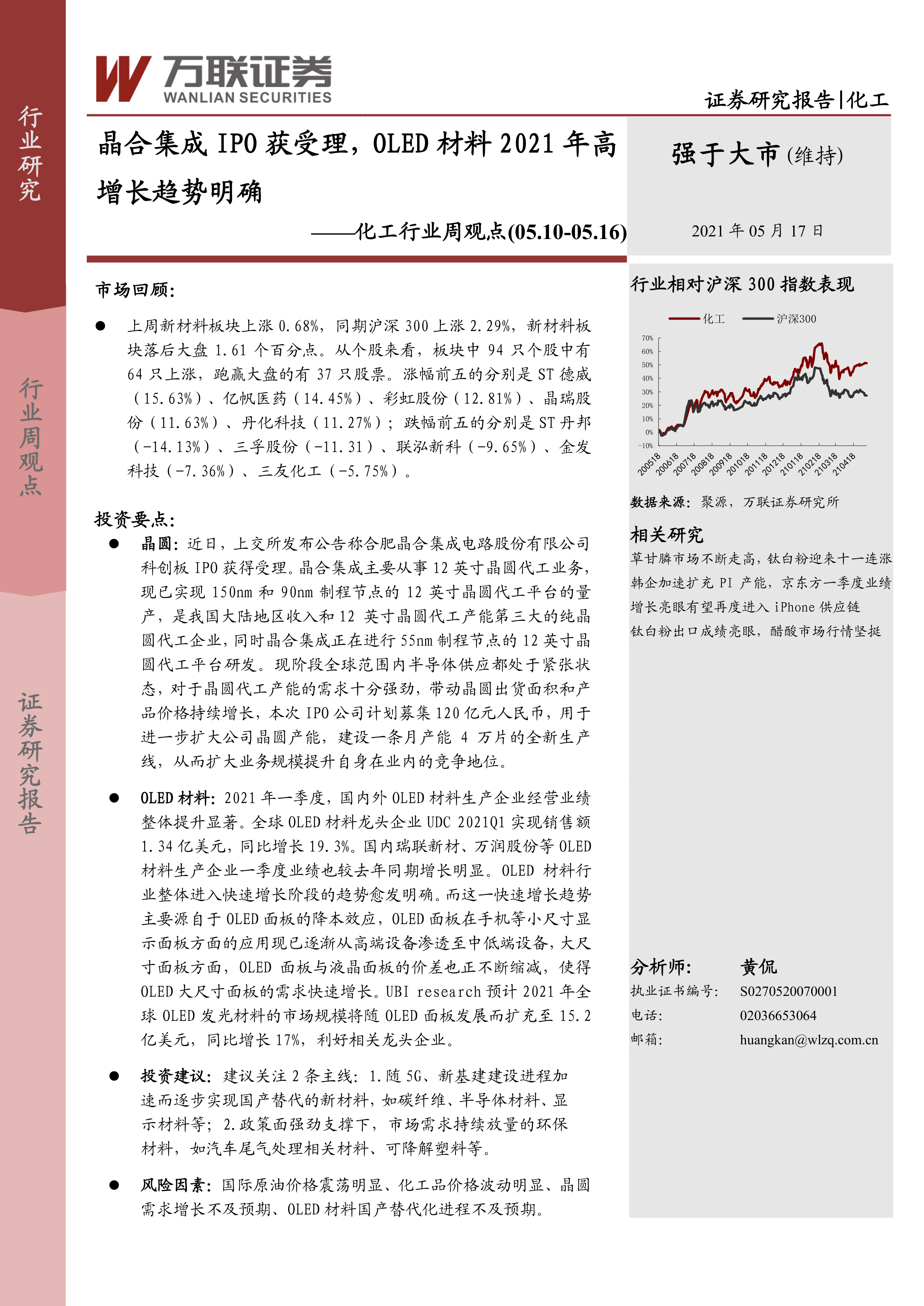 化工行业周观点:晶合集成IPO获受理,OLED材料2021年高增长趋势明确