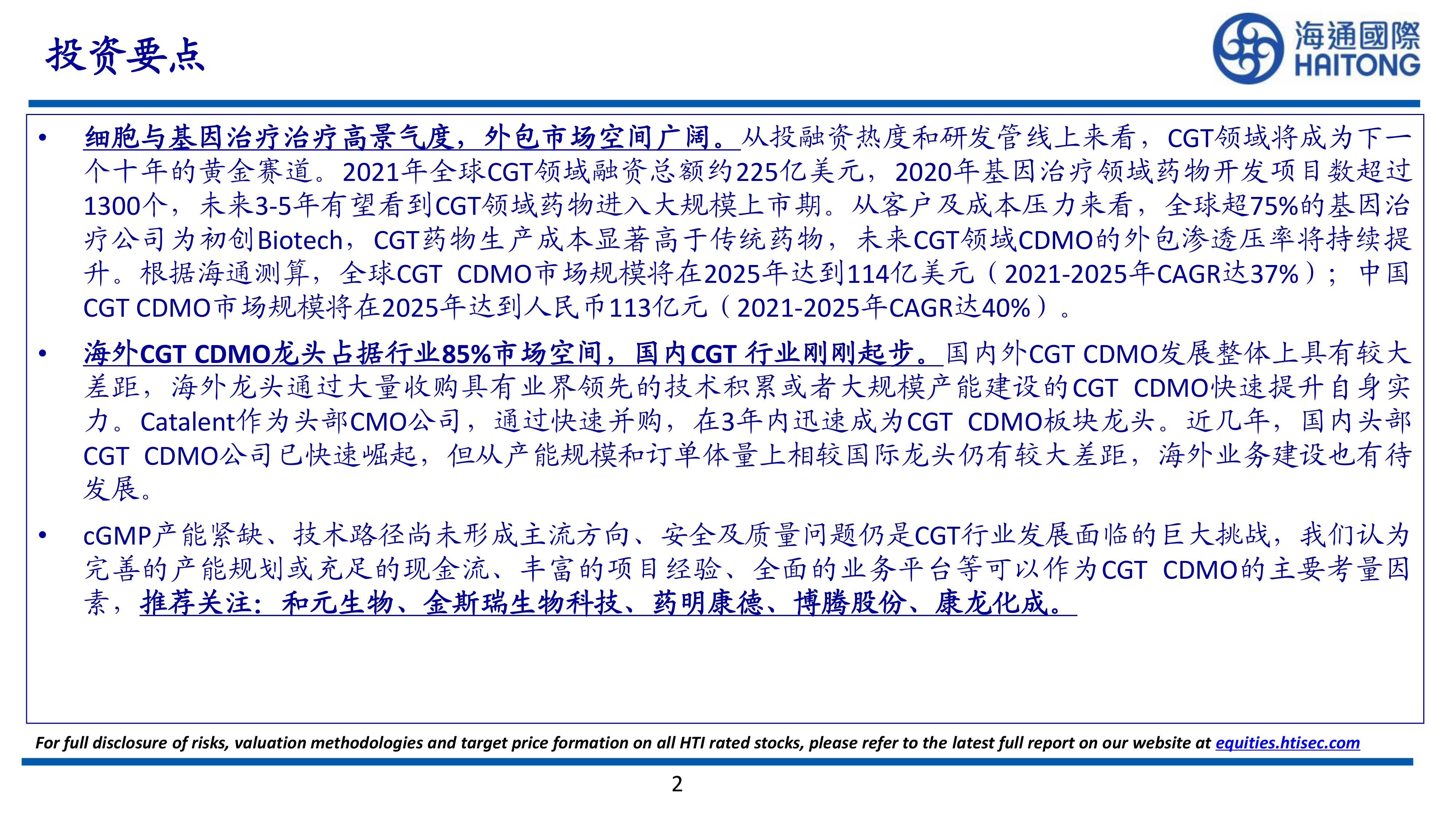 cGMP产能紧缺、技术路径尚未形成主流方向、安全及质量问题仍是CGT行业发展面临的巨大挑战,我们认为完善的产能规划或充足的现金流、丰富的项目经验、全面的业务平台等可以作为CGTCDMO的主要考量因素,推荐关注:和元生物、金斯瑞生物科技、药明康德、博腾股份、康龙化成。