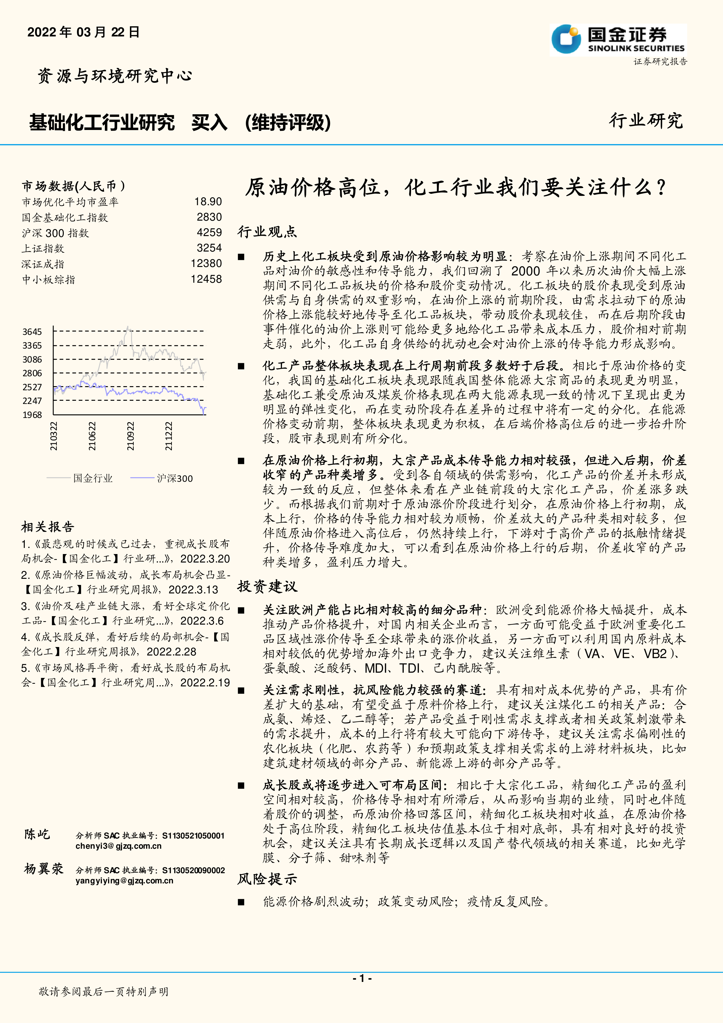 成长股或将逐步进入可布局区间:相比于大宗化工品,精细化工产品的盈利空间相对较高,价格传导相对有所滞后,从而影响当期的业绩,同时也伴随着股价的调整,而原油价格回落区间,精细化工板块相对收益,在原油价格处于高位阶段,精细化工板块估值基本位于相对底部,具有相对良好的投资机会,建议关注具有长期成长逻辑以及国产替代领域的相关赛道,比如光学膜、分子筛、甜味剂等