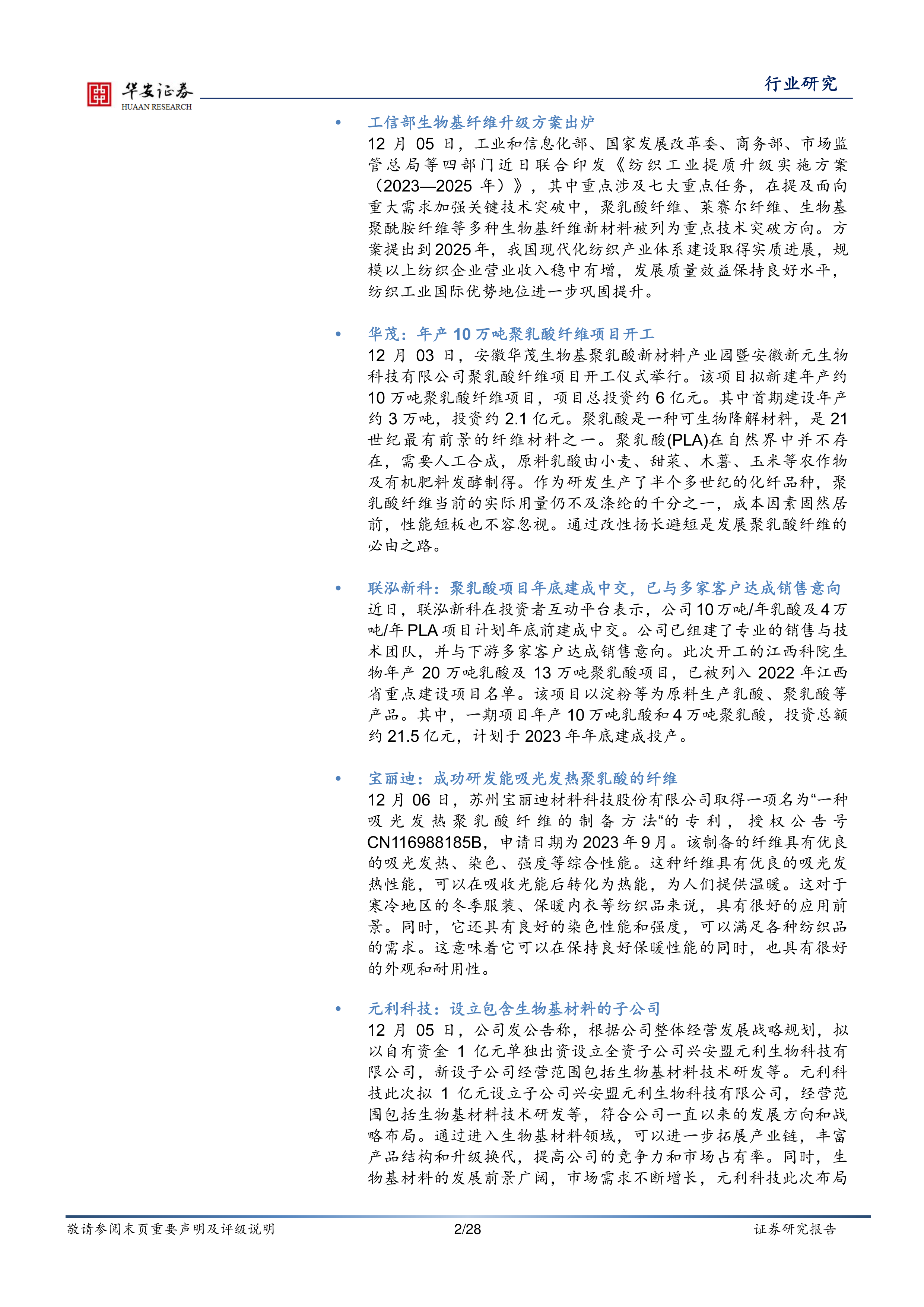 12月05日,工业和信息化部、国家发展改革委、商务部、市场监管总局等四部门近日联合印发《纺织工业提质升级实施方案(2023—2025年)》,其中重点涉及七大重点任务,在提及面向重大需求加强关键技术突破中,聚乳酸纤维、莱赛尔纤维、生物基聚酰胺纤维等多种生物基纤维新材料被列为重点技术突破方向。方案提出到2025年,我国现代化纺织产业体系建设取得实质进展,规模以上纺织企业营业收入稳中有增,发展质量效益保持良好水平,纺织工业国际优势地位进一步巩固提升。