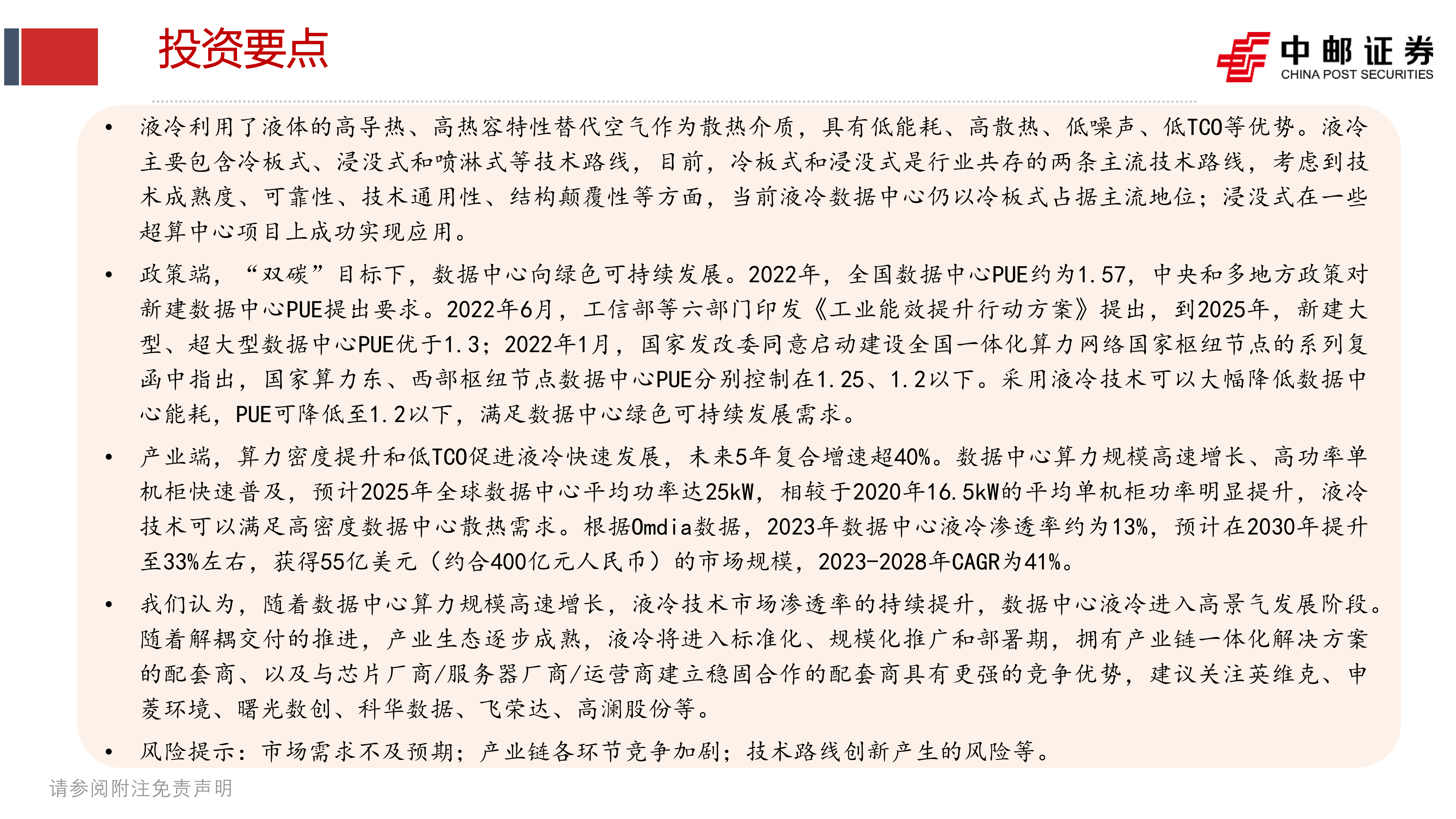 我们认为,随着数据中心算力规模高速增长,液冷技术市场渗透率的持续提升,数据中心液冷进入高景气发展阶段。随着解耦交付的推进,产业生态逐步成熟,液冷将进入标准化、规模化推广和部署期,拥有产业链一体化解决方案的配套商、以及与芯片厂商/服务器厂商/运营商建立稳固合作的配套商具有更强的竞争优势,建议关注英维克、申菱环境、曙光数创、科华数据、飞荣达、高澜股份等。