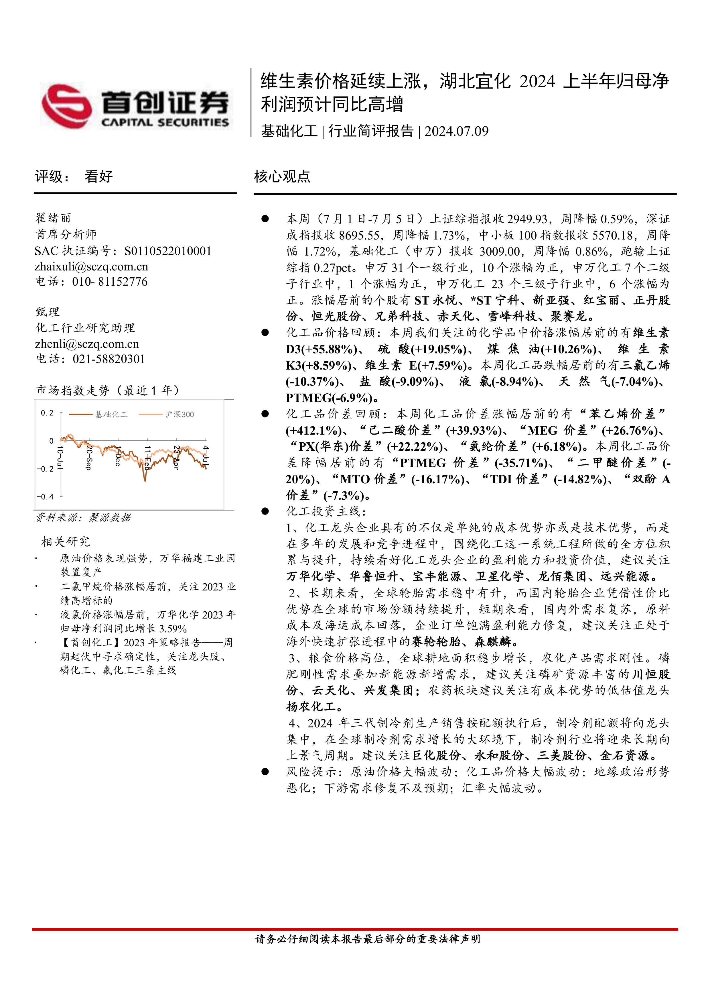 基础化工行业简评报告:维生素价格延续上涨,湖北宜化2024上半年归母净利润预计同比高增