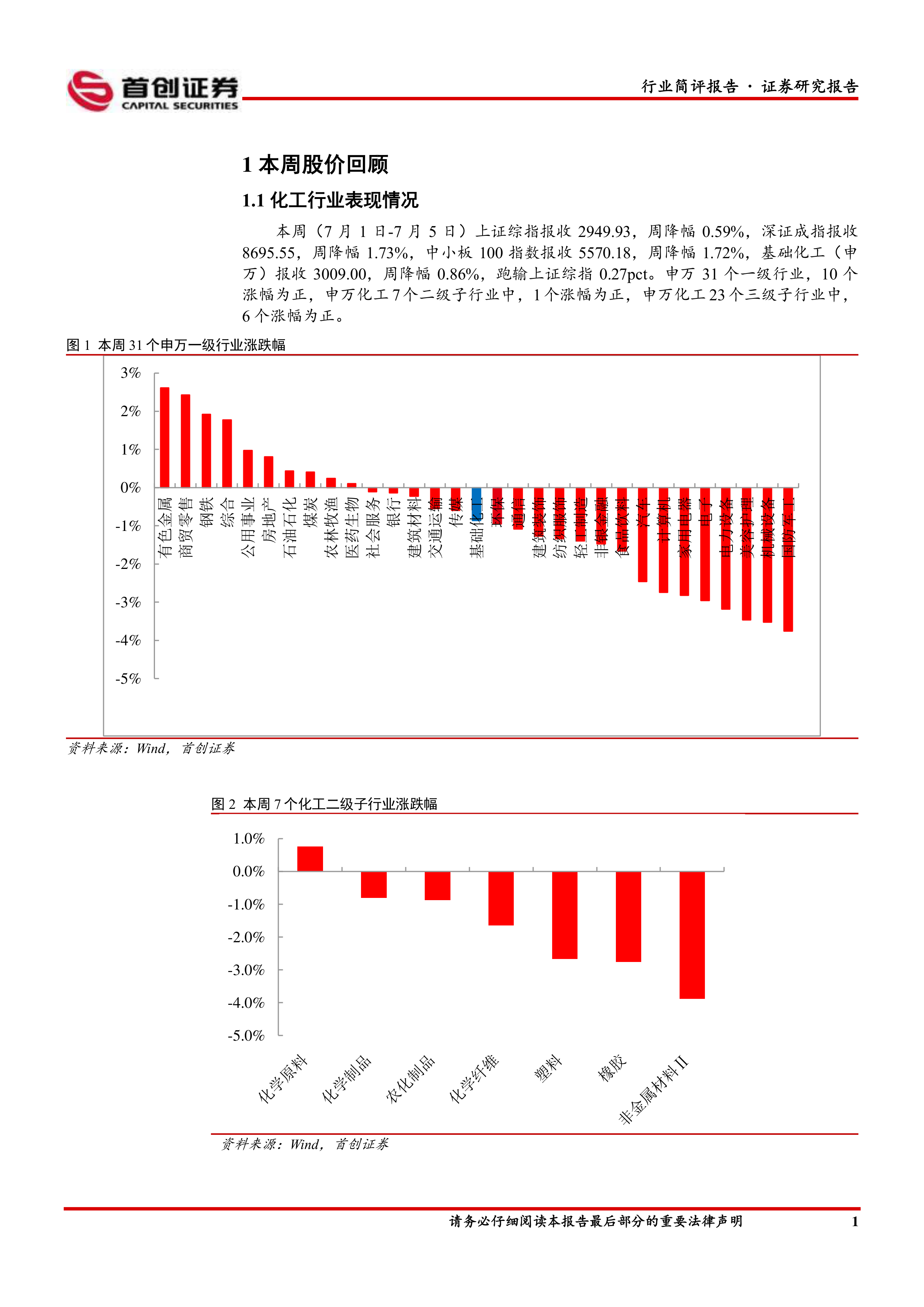 本周(7月1日-7月5日)上证综指报收2949.93,周降幅0.59%,深证成指报收8695.55,周降幅1.73%,中小板100指数报收5570.18,周降幅1.72%,基础化工(申万)报收3009.00,周降幅0.86%,跑输上证综指0.27pct。申万31个一级行业,10个涨幅为正,申万化工7个二级子行业中,1个涨幅为正,申万化工23个三级子行业中,6个涨幅为正。涨幅居前的个股有ST永悦、*ST宁科、新亚强、红宝丽、正丹股份、恒光股份、兄弟科技、赤天化、雪峰科技、聚赛龙。