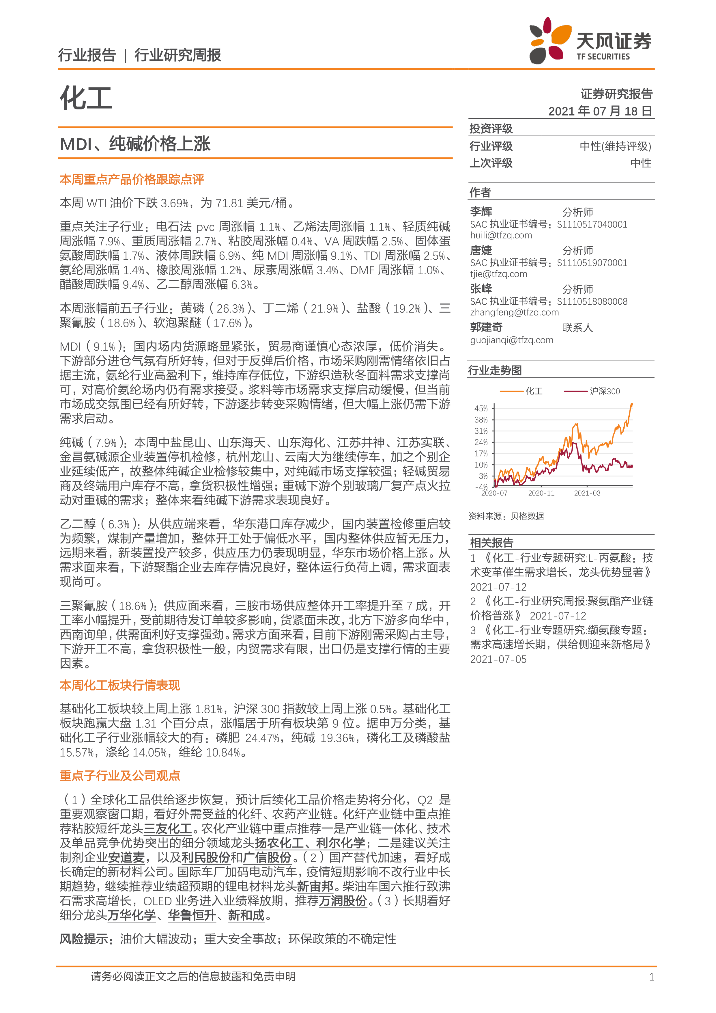 本周(截至2021年7月18日),基础化工板块较上周上涨1.81%,跑赢沪深300指数(上涨0.5%)1.31个百分点,在所有板块中涨幅位居第9位。在申万分类下,基础化工子行业中涨幅较大的包括:磷肥(24.47%)、纯碱(19.36%)、磷化工及磷酸盐(15.57%)、涤纶(14.05%)和维纶(10.84%)。