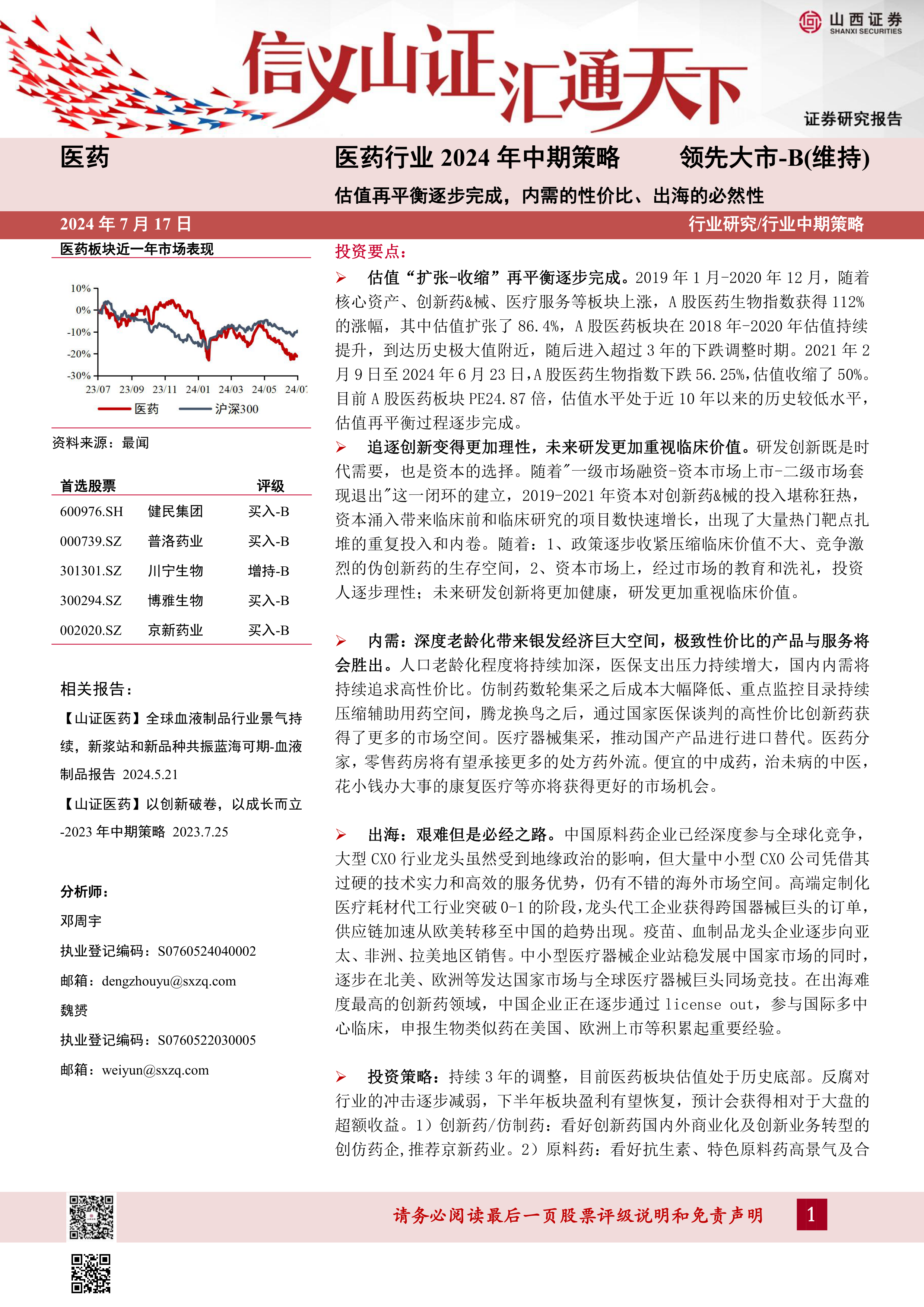 投资策略:持续3年的调整,目前医药板块估值处于历史底部。反腐对行业的冲击逐步减弱,下半年板块盈利有望恢复,预计会获得相对于大盘的超额收益。1)创新药/仿制药:看好创新药国内外商业化及创新业务转型的创仿药企,推荐京新药业。2)原料药:看好抗生素、特色原料药高景气及合成生物学业务落地带来增量的原料药企业,推荐川宁生物、普洛药业。3)血液制品:看好采浆量提升及血液制品新品种上市带来增量的企业,推荐博雅生物。4)中药:看好新一版基药目录中药数量增加带来市场扩容的企业,推荐健民集团。