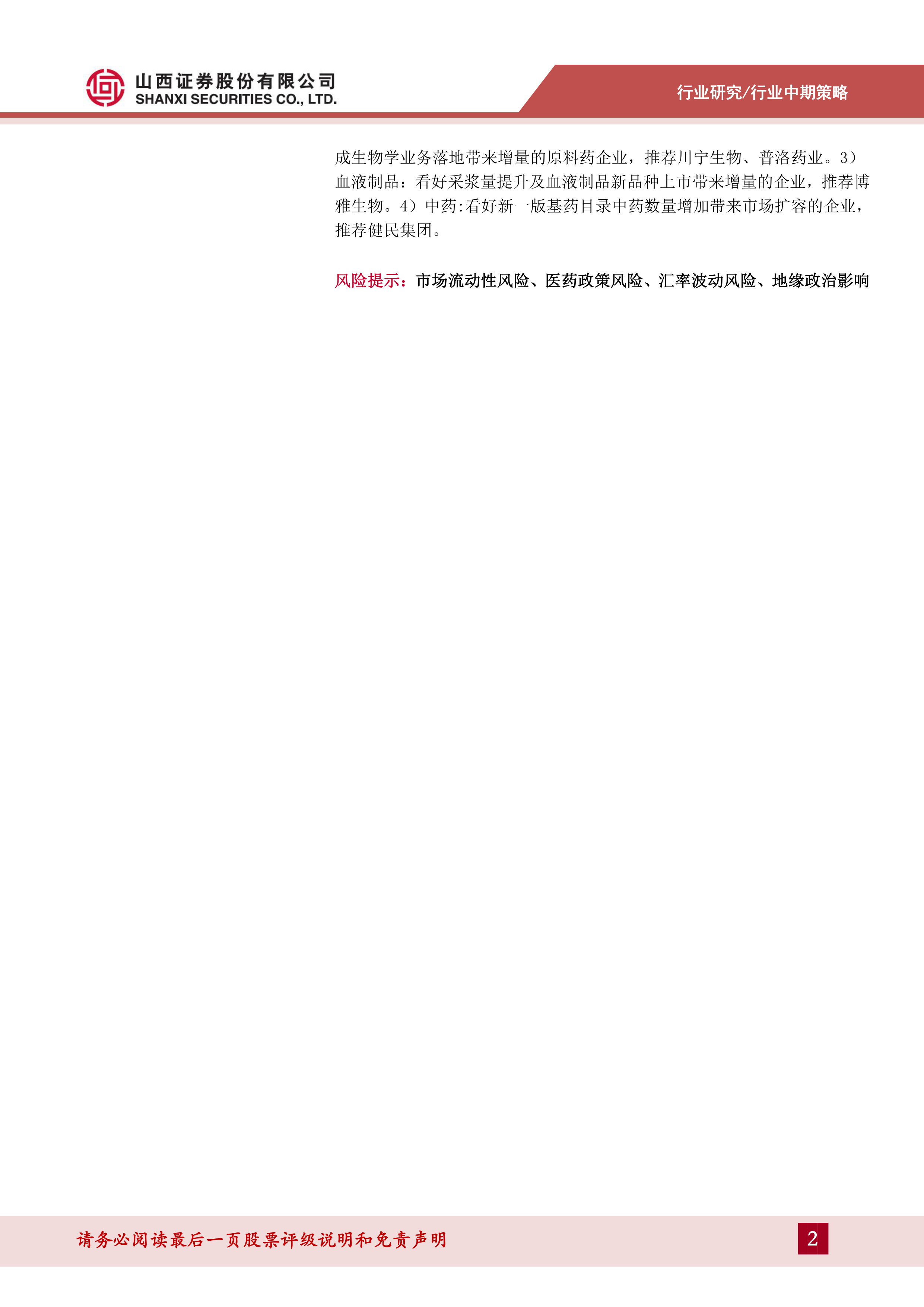 报告提示的风险包括:宏观环境风险、市场流动性风险、医药政策风险、人民币汇率变化对出口型企业的影响、地缘政治风险。