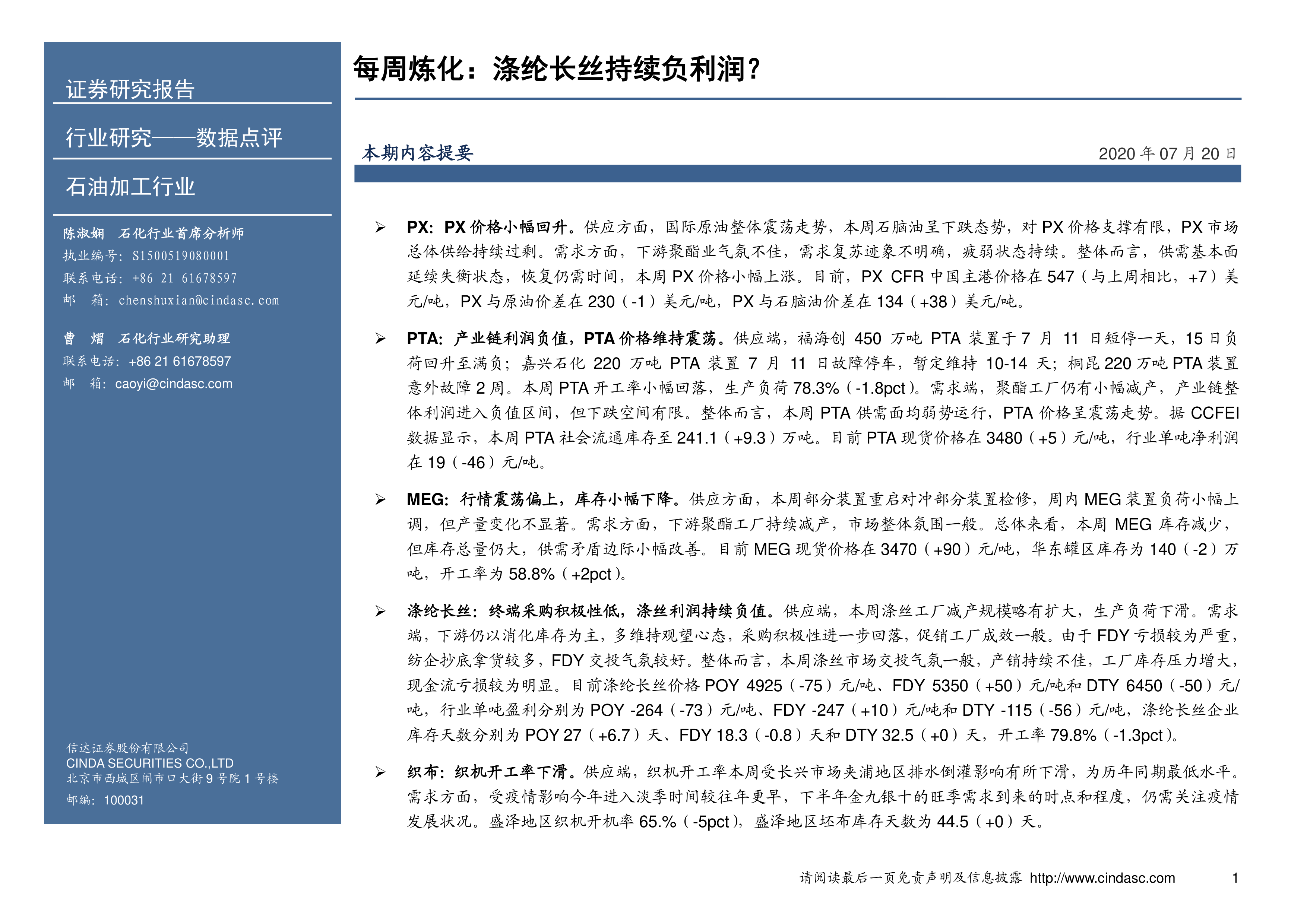 本报告核心观点指出,在2020年7月20日当周,石油加工行业下游的涤纶长丝市场持续面临负利润的严峻挑战。上游PX价格小幅回升,PTA和MEG价格震荡,但整个聚酯产业链的利润普遍承压,特别是涤纶长丝产品现金流亏损明显。市场供需失衡、下游需求疲软以及高库存是导致这一局面的主要原因。