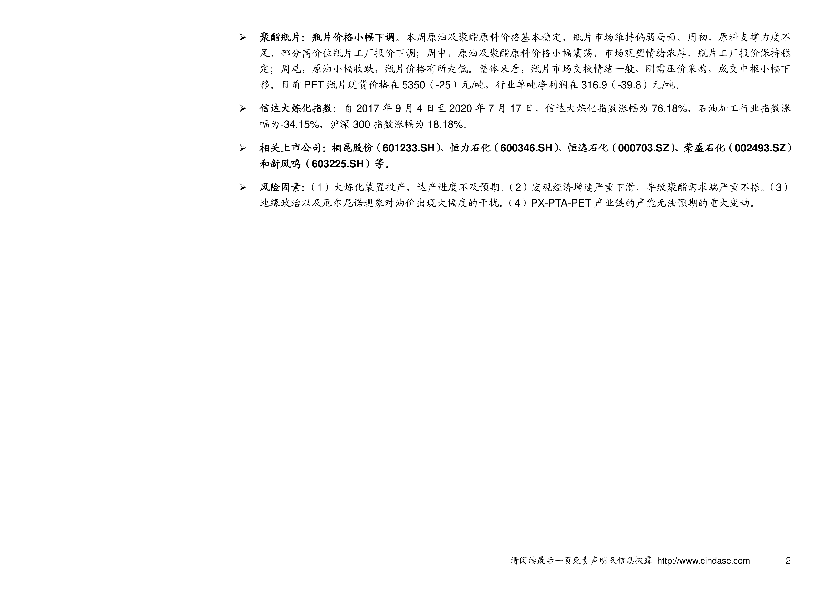 本报告深入分析了2020年7月20日当周石油加工行业的市场动态,揭示了涤纶长丝行业持续面临负利润的困境。上游PX价格虽有小幅回升,但整体供需失衡,PTA和MEG市场也呈现震荡和库存压力。下游涤纶长丝因终端需求疲软、采购积极性低迷,导致工厂减产、库存高企,现金流亏损显著。织布行业开工率下滑,聚酯瓶片价格及利润亦承压。信达大炼化指数表现优于行业及沪深300指数,但宏观经济、地缘政治及产业链产能变动等风险因素仍需警惕。整体而言,聚酯产业链面临严峻的市场挑战,短期内盈利能力改善空间有限。