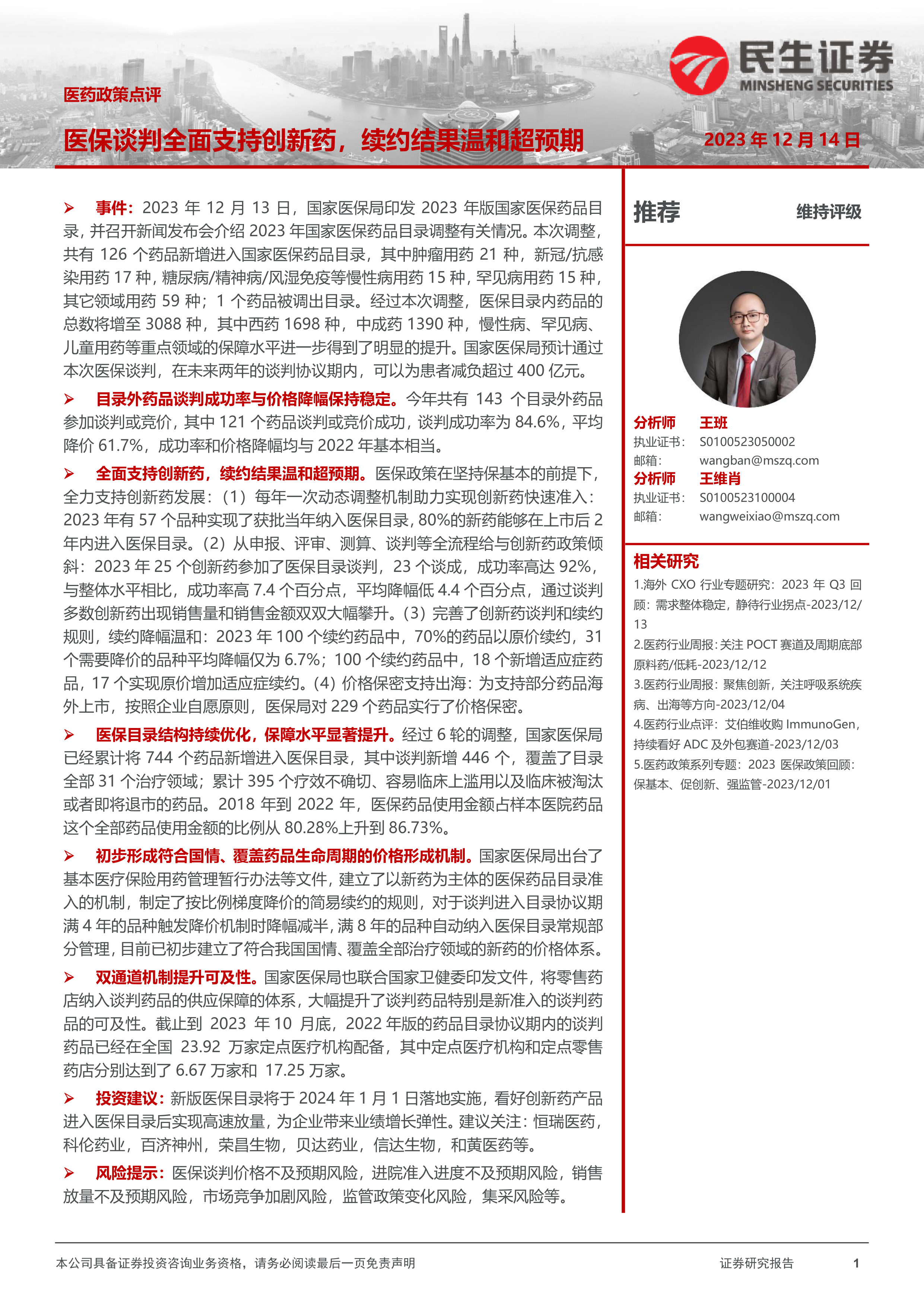 医药政策点评:医保谈判全面支持创新药,续约结果温和超预期