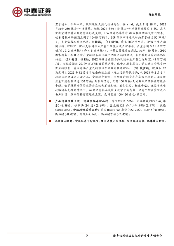 中泰化工周度观点22W41:天然气价格大幅回落,美国抛储不改油价上行
