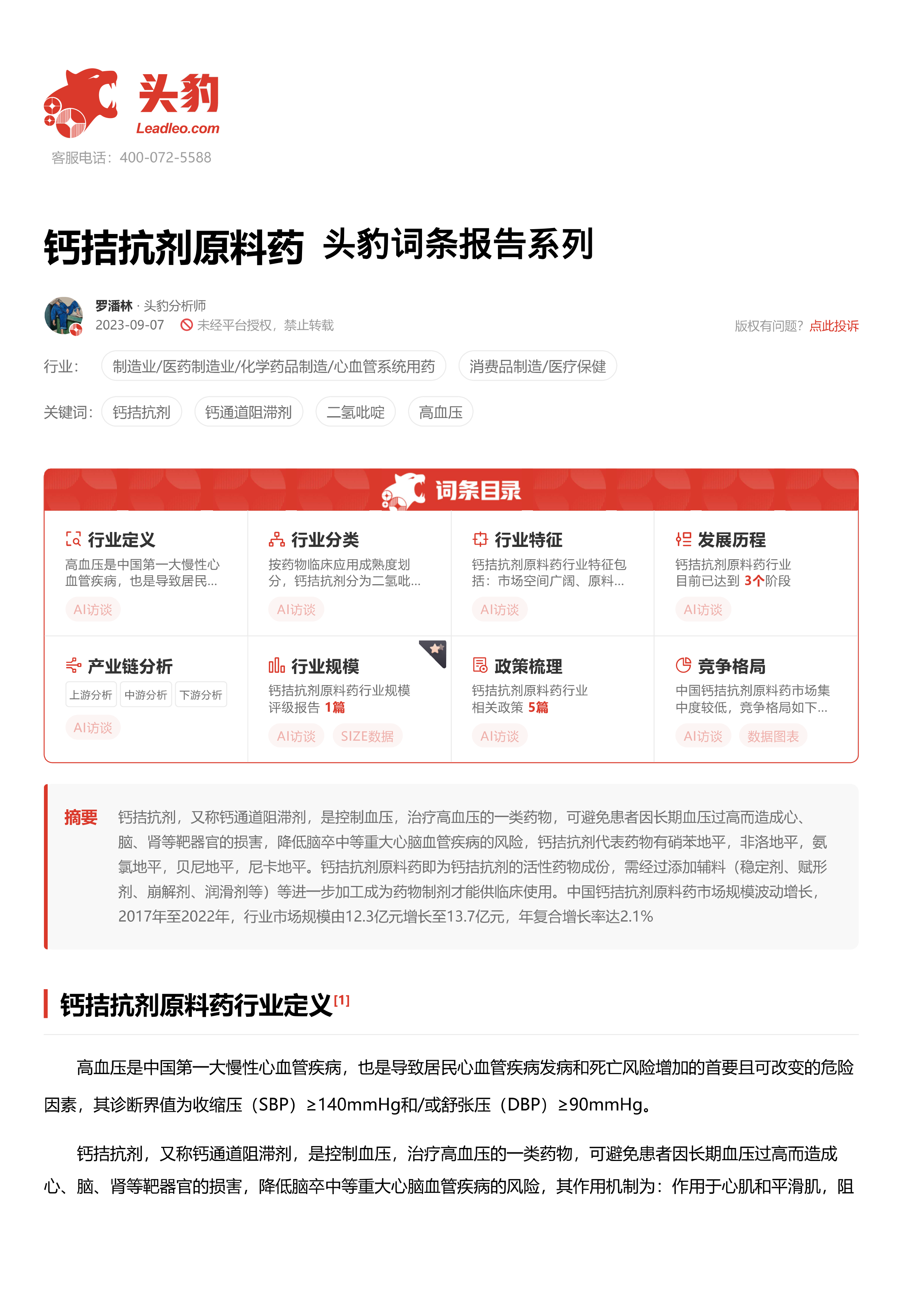钙拮抗剂原料药 头豹词条报告系列