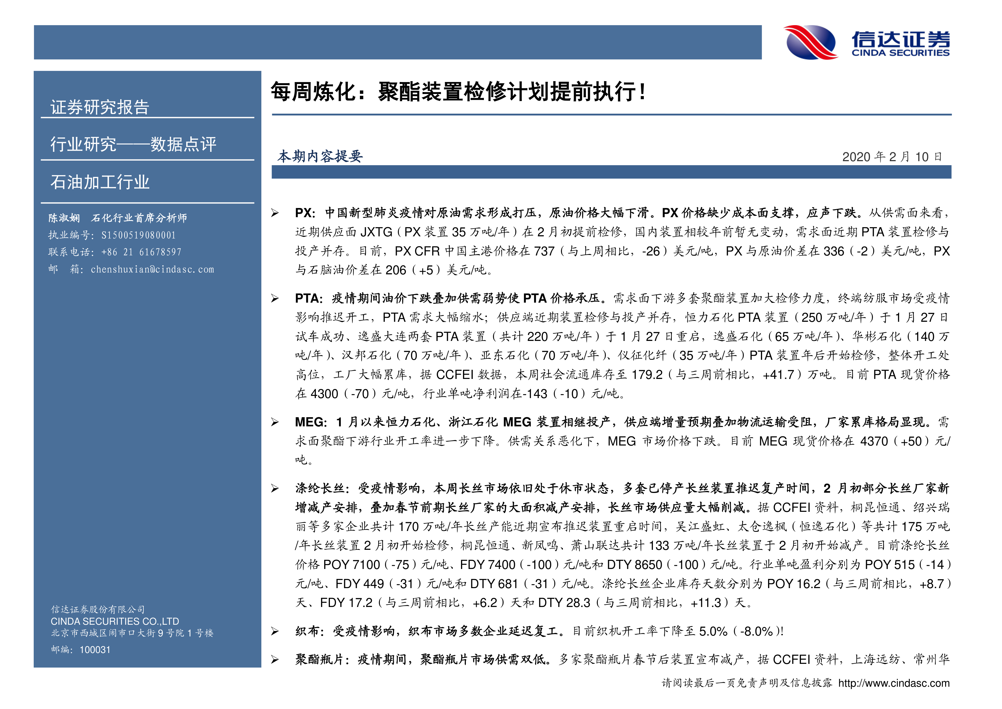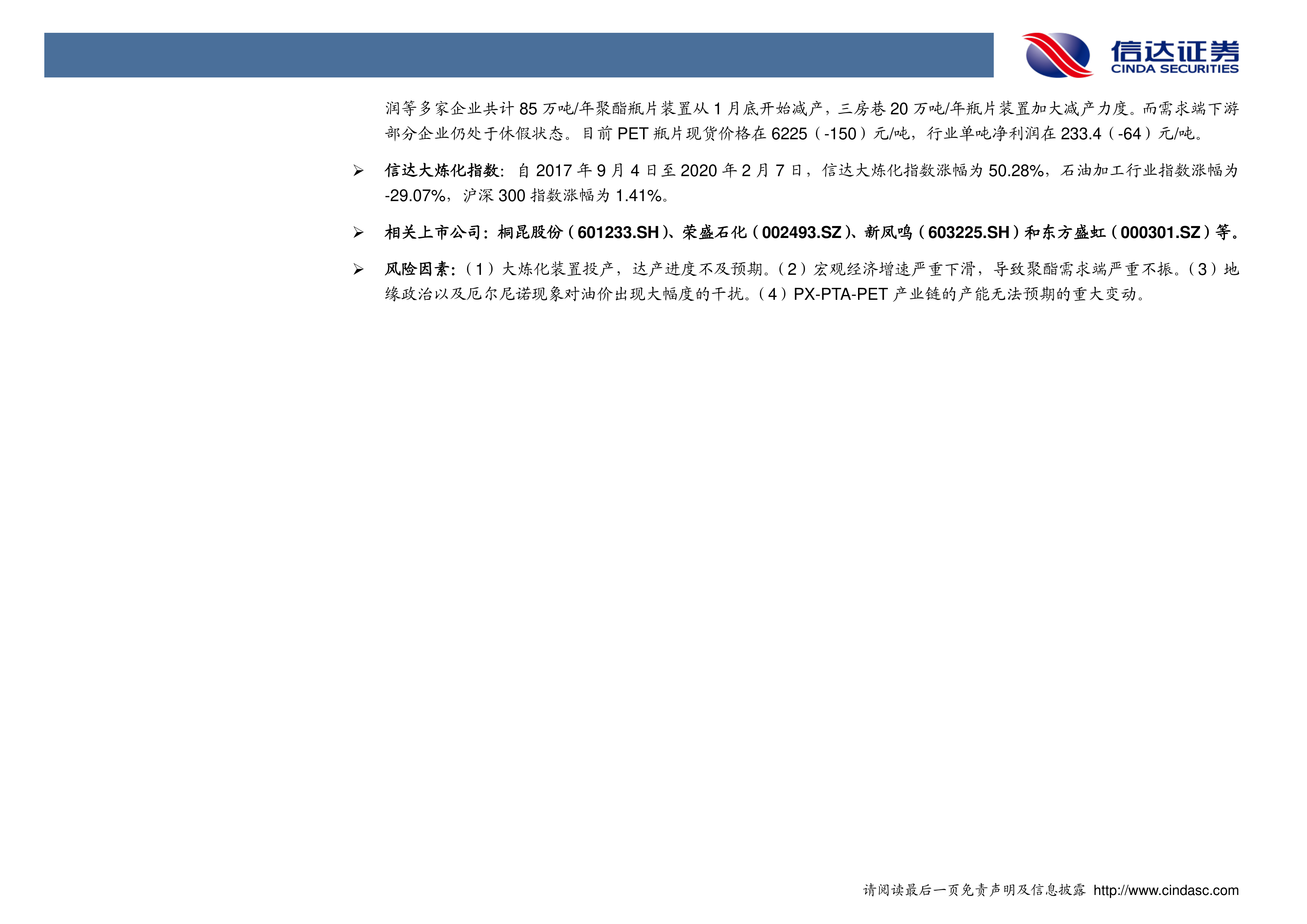本报告深入分析了2020年2月10日当周石油加工行业,特别是聚酯产业链的市场状况。核心观点指出,新型肺炎疫情对原油需求及下游纺服市场造成严重冲击,导致PX、PTA、涤纶长丝和聚酯瓶片等主要产品价格普遍下跌,产业链各环节盈利能力承压,库存高企。数据显示,PTA行业已出现亏损,涤纶长丝库存天数显著增加,织机开工率大幅下降,反映出供需失衡的严峻局面。尽管行业面临多重挑战,信达大炼化指数表现出较强的抗风险能力和增长韧性,显著优于大盘和行业指数。报告同时提示了大炼化装置投产不及预期、宏观经济下滑、油价波动及产业链产能变动等潜在风险。
