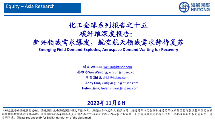 化工全球系列报告之十五:碳纤维深度报告:新兴领域需求爆发,航空航天领域需求静待复苏