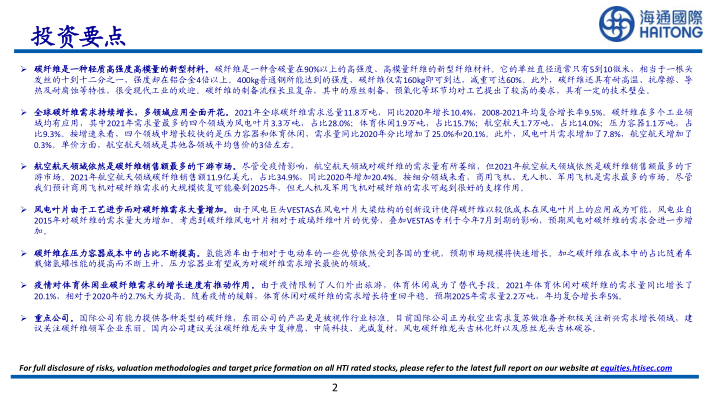 重点公司。国际公司有能力提供各种类型的碳纤维,东丽公司的产品更是被视作行业标准。目前国际公司正为航空业需求复苏做准备并积极关注新兴需求增长领域,建议关注碳纤维领军企业东丽。国内公司建议关注碳纤维龙头中复神鹰、中简科技、光威复材,风电碳纤维龙头吉林化纤以及原丝龙头吉林碳谷。