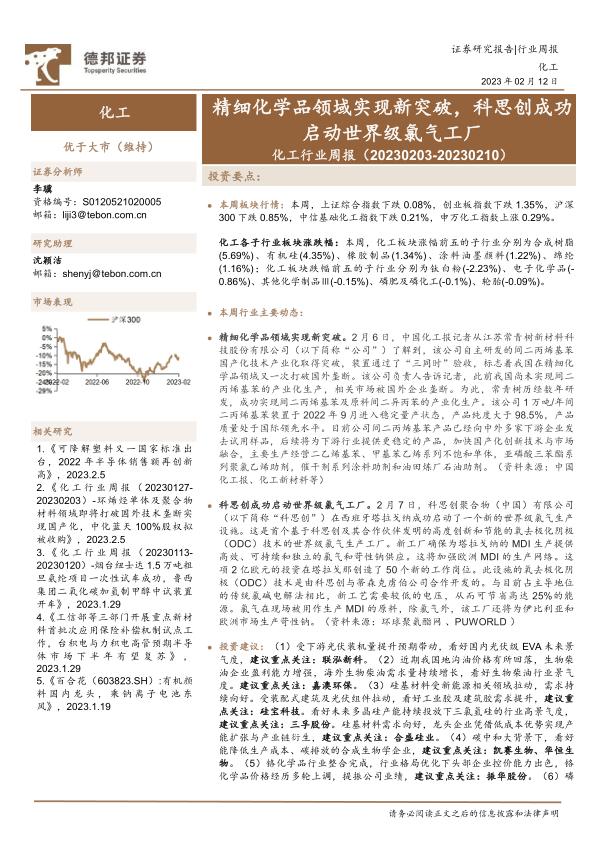 本周(20230203-20230210),A股市场主要指数涨跌互现。上证综合指数下跌0.08%,创业板指数下跌1.35%,沪深300指数下跌0.85%。化工行业内部,中信基础化工指数下跌0.21%,而申万化工指数上涨0.29%。
