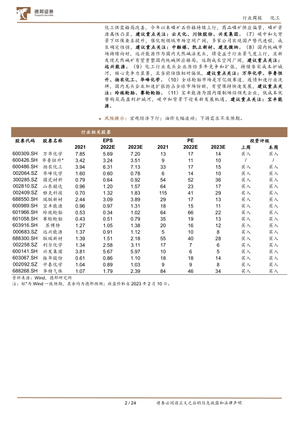 投资建议: (1) 受下游光伏装机量提升预期带动, 看好国内光伏级 EVA 未来景气度, 建议重点关注: 联泓新科。 (2) 近期我国地沟油价格有所回落, 生物柴油企业盈利能力增强, 海外生物柴油需求量持续增长, 看好生物柴油行业景气度。 建议重点关注: 嘉澳环保。 (3) 硅基材料受新能源相关领域拉动, 需求持续向好。 受装配式建筑及光伏组件拉动, 看好工业胶及建筑胶需求提升, 建议重点关注: 硅宝科技。 看好未来多晶硅产能持续投放下三氯氢硅的行业高景气度,建议重点关注: 三孚股份。 硅基材料需求向好, 龙头企业凭借低成本优势实现产能扩张与产业链衍生, 建议重点关注: 合盛硅业。 (4) 碳中和大背景下, 看好能降低生产成本、 碳排放的合成生物学企业, 建议重点关注: 凯赛生物、 华恒生物。 (5) 铬化学品行业整合完成, 行业格局优化下头部企业控价能力出色, 铬化学品价格经历多轮上调, 提振公司业绩, 建议重点关注: 振华股份。 (6) 磷化工供需格局改善, 今年以来磷矿石价格持续上行, 商品磷矿供应偏紧, 磷矿资源属性凸显, 建议重点关注: 云天化、 川恒股份、 兴发集团。 (7) 碳中和大背景下环保要求提升, 催化剂领域市场空间广阔, 多家公司实现国产替代进程, 成长确定性强, 建议重点关注: 中触媒、 凯立新材、 建龙微纳。 (8) 国内纯碱市场持续向好, 远兴能源作为国内天然碱法龙头, 将受益于行业景气度上行, 且新发现天然碱矿有望重塑国内纯碱供应格局, 远期成长空间广阔, 建议重点关注:远兴能源。 ( 9) 化工行业龙头企业历经多年竞争和扩张, 持续夯实成本护城河, 核心竞争力显著, 且当前估值相对偏低, 建议重点关注: 万华化学、 华鲁恒升、 扬农化工、 华峰化学。 (10) 全球轮胎市场是万亿级赛道, 疫情加速行业洗牌, 国内龙头企业加速扩张抢占全球市场份额, 有望保持快速发展, 建议重点关注: 玲珑轮胎、 赛轮轮胎。 (11) 宝丰能源为国内煤制烯烃领先企业, 低成本优势构筑高盈利护城河, 碳中和背景下迎来新发展机遇, 建议重点关注: 宝丰能源。