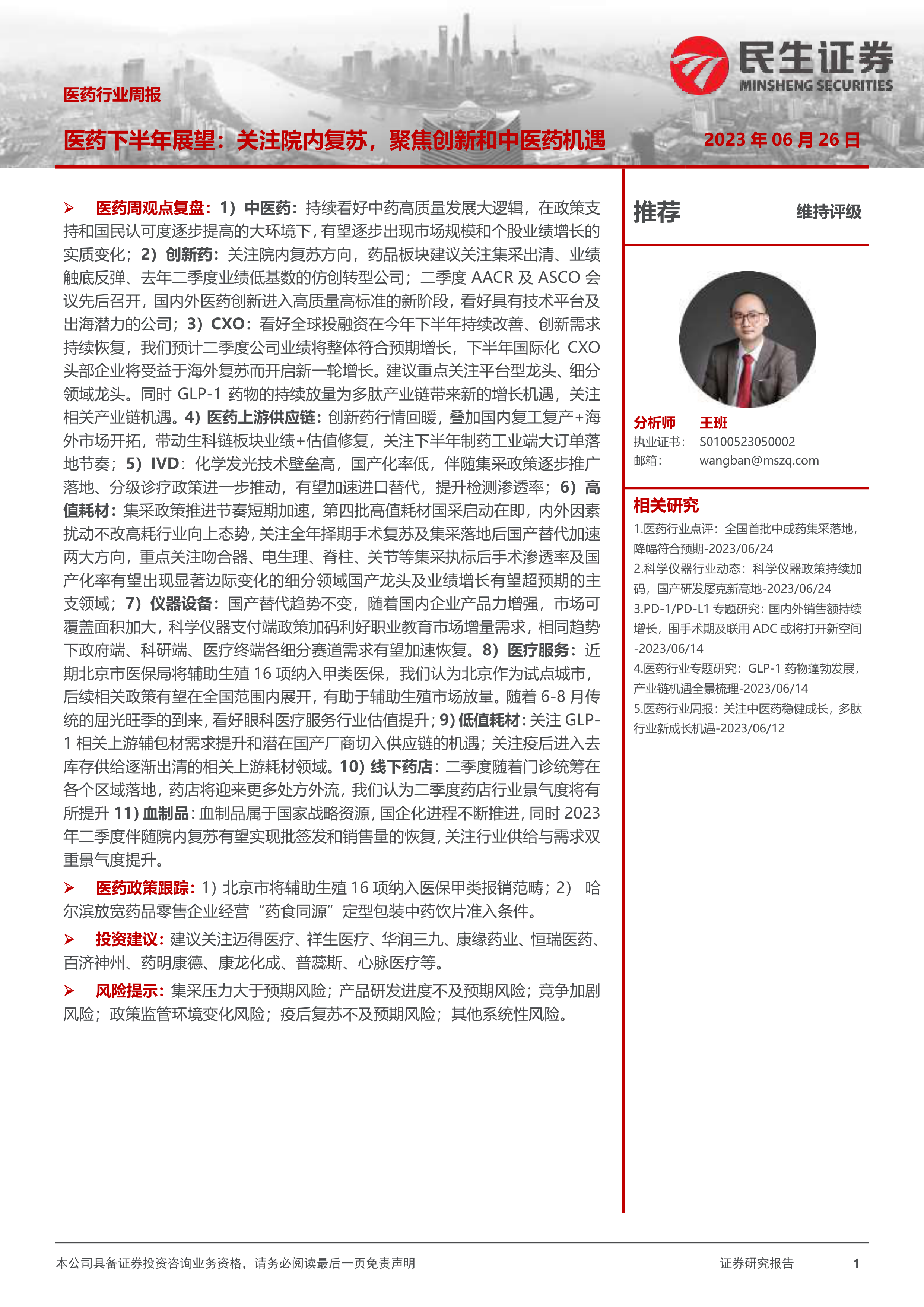 医药周观点复盘:1)中医药:持续看好中药高质量发展大逻辑,在政策支持和国民认可度逐步提高的大环境下,有望逐步出现市场规模和个股业绩增长的实质变化;2)创新药:关注院内复苏方向,药品板块建议关注集采出清、业绩触底反弹、去年二季度业绩低基数的仿创转型公司;二季度AACR及ASCO会议先后召开,国内外医药创新进入高质量高标准的新阶段,看好具有技术平台及出海潜力的公司;3)CXO:看好全球投融资在今年下半年持续改善、创新需求持续恢复,我们预计二季度公司业绩将整体符合预期增长,下半年国际化CXO头部企业将受益于海外复苏而开启新一轮增长。建议重点关注平台型龙头、细分领域龙头。同时GLP-1药物的持续放量为多肽产业链带来新的增长机遇,关注相关产业链机遇。4)医药上游供应链:创新药行情回暖,叠加国内复工复产+海外市场开拓,带动生科链板块业绩+估值修复,关注下半年制药工业端大订单落地节奏;5)IVD:化学发光技术壁垒高,国产化率低,伴随集采政策逐步推广落地、分级诊疗政策进一步推动,有望加速进口替代,提升检测渗透率;6)高值耗材:集采政策推进节奏短期加速,第四批高值耗材国采启动在即,内外因素扰动不改高耗行业向上态势,关注全年择期手术复苏及集采落地后国产替代加速两大方向,重点关注吻合器、电生理、脊柱、关节等集采执标后手术渗透率及国产化率有望出现显著边际变化的细分领域国产龙头及业绩增长有望超预期的主支领域;7)仪器设备:国产替代趋势不变,随着国内企业产品力增强,市场可覆盖面积加大,科学仪器支付端政策加码利好职业教育市场增量需求,相同趋势下政府端、科研端、医疗终端各细分赛道需求有望加速恢复。8)医疗服务:近期北京市医保局将辅助生殖16项纳入甲类医保,我们认为北京作为试点城市,后续相关政策有望在全国范围内展开,有助于辅助生殖市场放量。随着6-8月传统的屈光旺季的到来,看好眼科医疗服务行业估值提升;9)低值耗材:关注GLP-1相关上游辅包材需求提升和潜在国产厂商切入供应链的机遇;关注疫后进入去库存供给逐渐出清的相关上游耗材领域。10)线下药店:二季度随着门诊统筹在各个区域落地,药店将迎来更多处方外流,我们认为二季度药店行业景气度将有所提升11)血制品:血制品属于国家战略资源,国企化进程不断推进,同时2023年二季度伴随院内复苏有望实现批签发和销售量的恢复,关注行业供给与需求双重景气度提升。
