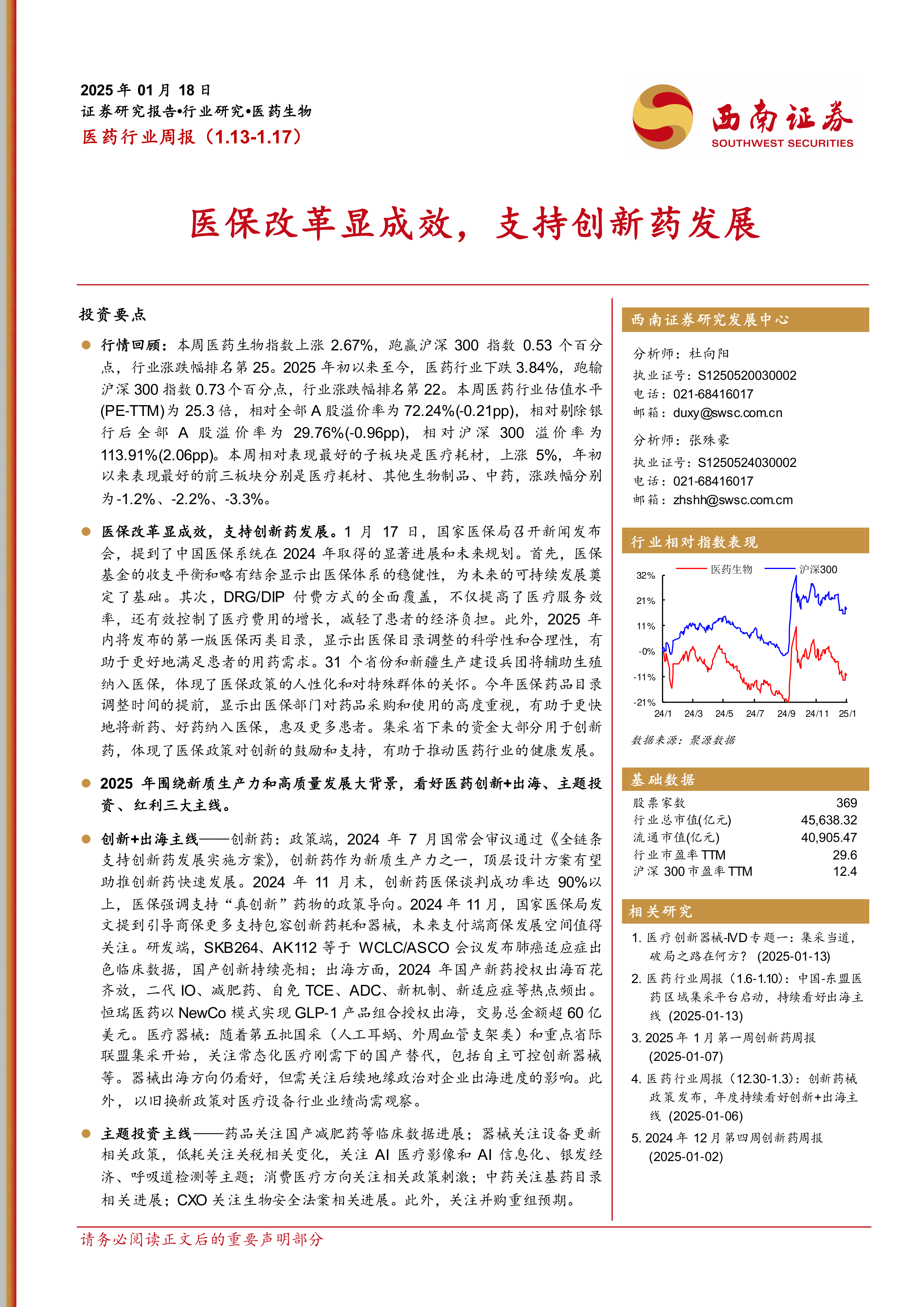 医保改革显成效,支持创新药发展。1月17日,国家医保局召开新闻发布会,提到了中国医保系统在2024年取得的显著进展和未来规划。首先,医保基金的收支平衡和略有结余显示出医保体系的稳健性,为未来的可持续发展奠定了基础。其次,DRG/DIP付费方式的全面覆盖,不仅提高了医疗服务效率,还有效控制了医疗费用的增长,减轻了患者的经济负担。此外,2025年内将发布的第一版医保丙类目录,显示出医保目录调整的科学性和合理性,有助于更好地满足患者的用药需求。31个省份和新疆生产建设兵团将辅助生殖纳入医保,体现了医保政策的人性化和对特殊群体的关怀。今年医保药品目录调整时间的提前,显示出医保部门对药品采购和使用的高度重视,有助于更快地将新药、好药纳入医保,惠及更多患者。集采省下来的资金大部分用于创新药,体现了医保政策对创新的鼓励和支持,有助于推动医药行业的健康发展。