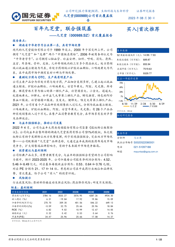 公司经典产品众多,消费者教育充分, 与益丰的强强联合有望助力公司影响力提升,预计 2023-2025 年,公司归属母公司股东净利润分别为: 4.52、5.46 和 6.49 亿元,对应基本每股收益分别为: 0.53、 0.64 和 0.76 元/股,对应 PE 分别为 21、 17 和 14 倍。考虑到公司在中成药行业地位和品牌优势,首次覆盖,给予公司“买入”的投资评级。