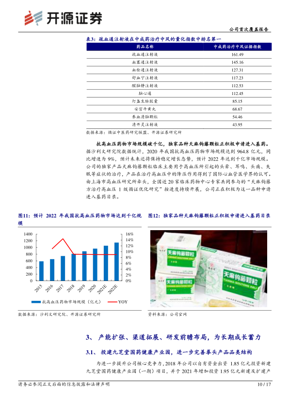 在抗高血压药物市场,沙利文研究院数据显示,2020年我国市场规模达到964.8亿元,同比增长9%,预计2022年将达到千亿规模。九芝堂的独家产品天麻钩藤颗粒临床主要用于高血压所引起的头晕、耳鸣、头痛、失眠等症状的治疗,其降压作用得到了国际心血管医学界的认可。公司正积极为这一品种申请进入基药目录,有望进一步扩大市场潜力。