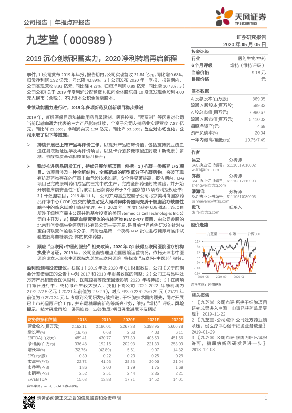 九芝堂在2019年受行业政策影响,归母净利润出现显著下滑,但公司积极通过产品再评价、创新药物研发(包括LFG抗凝新药、干细胞疗法、REMD-477糖尿病新药)以及拓展“互联网+中医药”服务等多元化战略进行应对。2020年一季度净利润的转增表明公司转型初见成效。尽管盈利预测有所下调,但鉴于公司在创新研发领域的持续投入和前瞻性布局,特别是干细胞技术和新型药物的进展,公司未来仍具备增长潜力。天风证券维持“增持”评级,并提示相关风险。