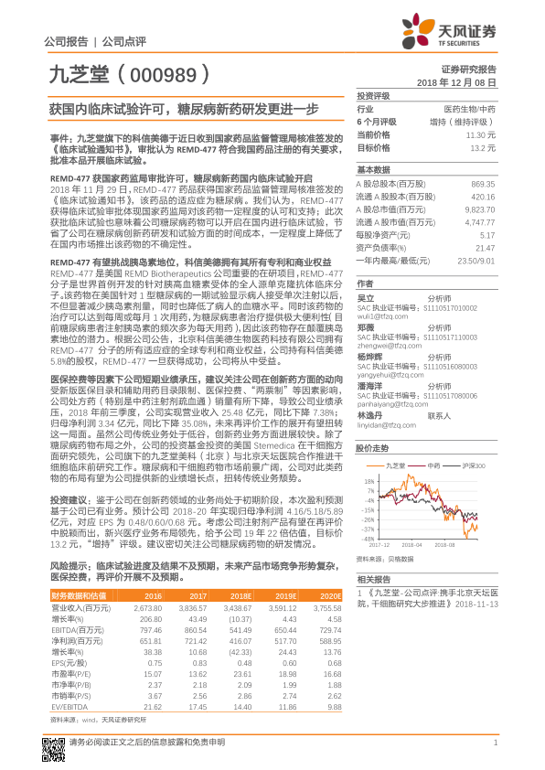 本报告对九芝堂的糖尿病新药REMD-477的研发进展进行了分析,认为该药物具有挑战胰岛素地位的潜力。同时,报告也指出了公司短期业绩承压的现状,并建议关注公司在创新药领域的布局。最后,报告给出了盈利预测和投资评级,并提示了相关风险。