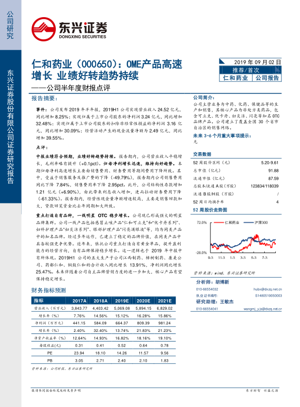 本报告由东兴证券发布,对仁和药业(000650)进行首次覆盖并给予“推荐”评级。核心观点如下: