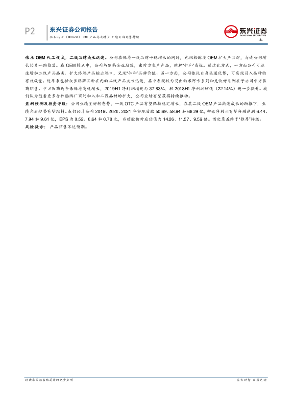 本报告对仁和药业进行了深入分析,认为公司业绩呈现好转态势,一线OTC产品有望保持稳定增长,同时二线OEM产品高速成长,共同推动公司业绩向好。东兴证券首次覆盖并给予“推荐”评级,建议投资者关注。但同时也提示了产品销售不达预期的风险。