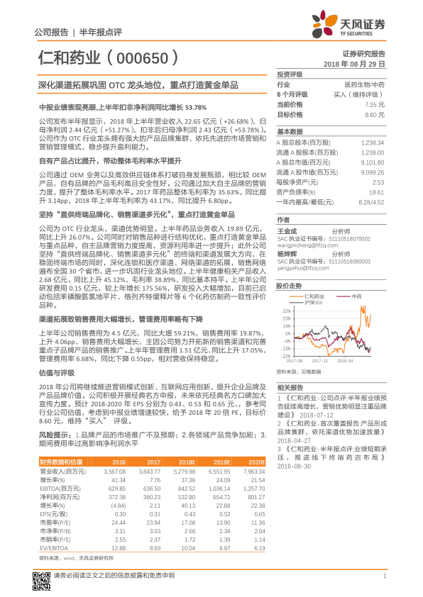 展望未来,公司预计在2018-2020年将继续推进营销模式创新和互联网应用创新,以提升企业品牌及产品品牌价值。同时,公司积极开展经典名方申报,未来将依托经典名方口碑加大宣传力度。根据预测,2018-2020年每股收益(EPS)预计分别为0.43元、0.53元和0.65元。考虑到公司中报业绩增速较快,分析师给予2018年20倍市盈率(PE),目标价8.60元,并维持“买入”评级。然而,报告也提示了潜在风险,包括品牌产品的市场推广不及预期、各领域产品竞争加剧以及期间费用率过高可能影响净利润水平。